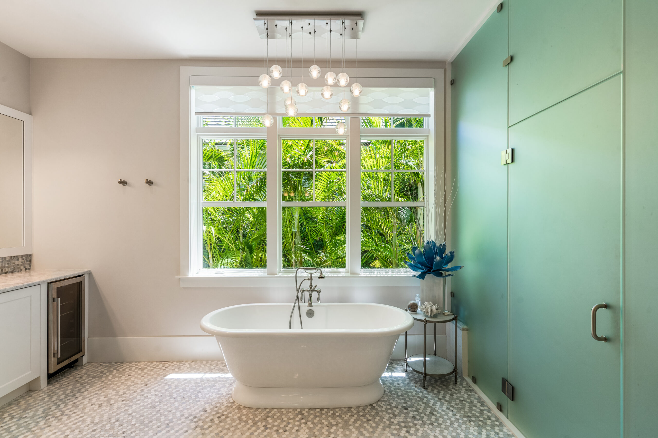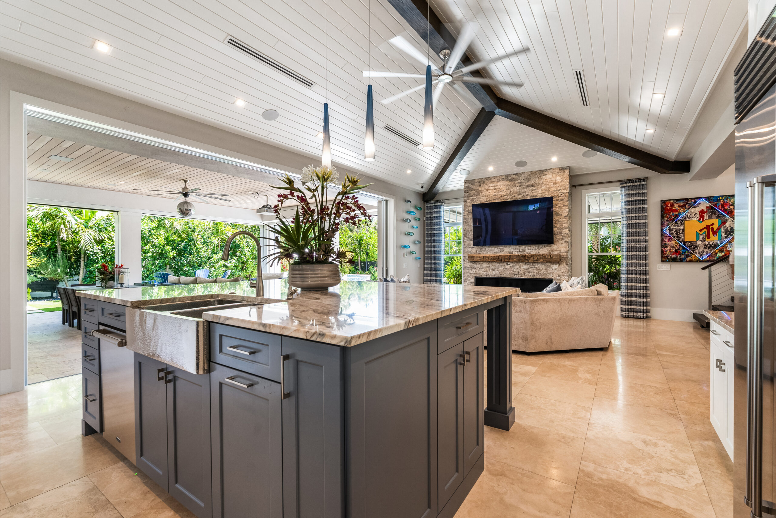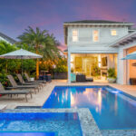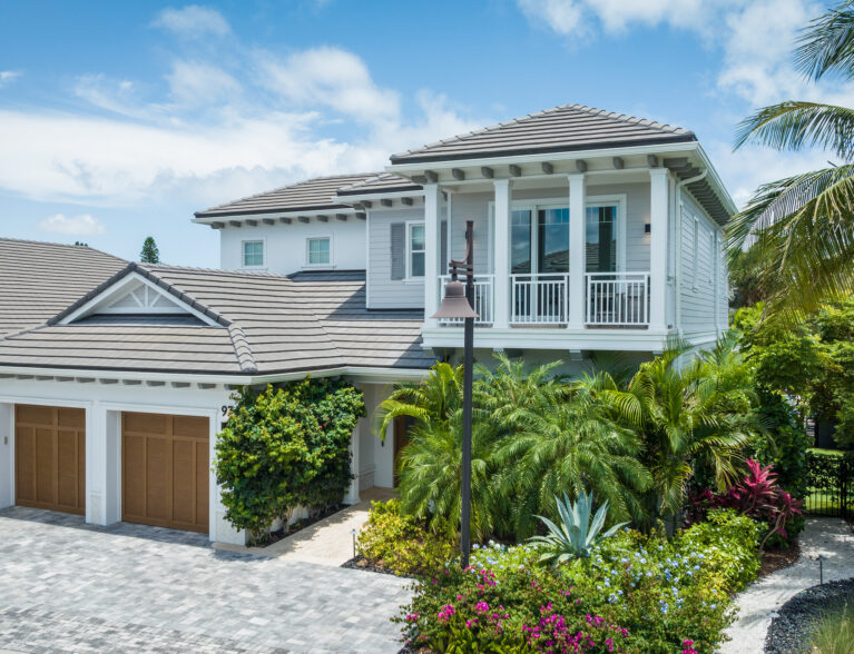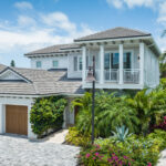 A paver driveway and lush, tropical landscaping enhance the home’s welcoming exterior, which blends classic British West Indies elements with clean, modern lines.