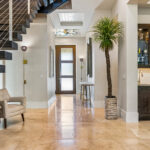 Further down the hall, the home opens into a light-filled, open-concept floorplan defined by soaring ceilings, custom millwork and travertine flooring. The expansive game room at the heart of the home sets the tone for this hub for social living.