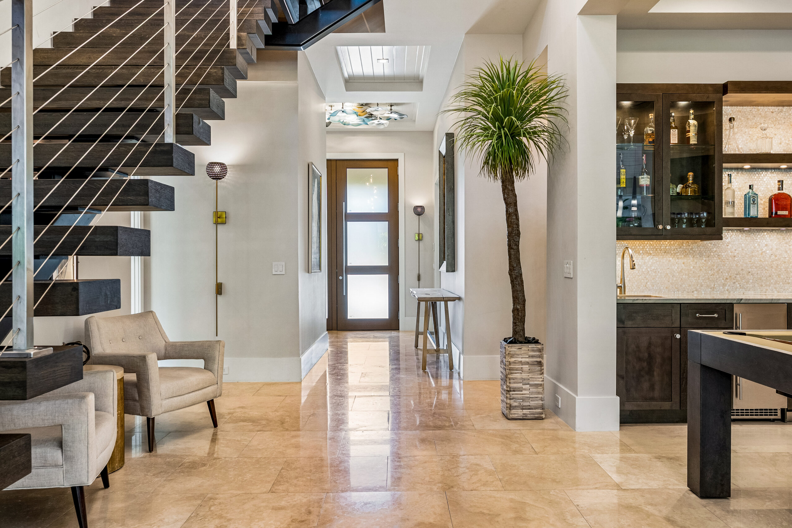 Once inside, you are drawn toward the communal indoor-outdoor gathering areas at the rear of the house. The two-car, air-conditioned garage – located just off the front entry – features one bay that has been converted into an entertainment lounge.