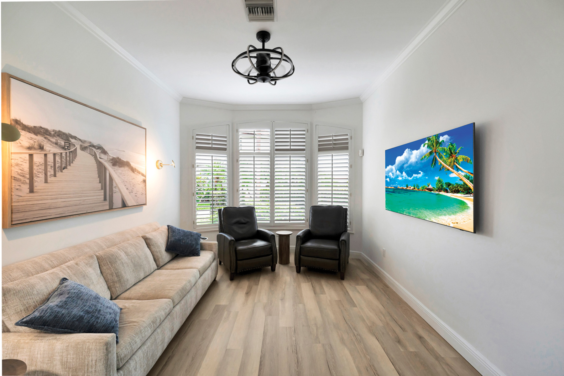 Ahead from the foyer is the central, open living room/dining room space, cooled by a gorgeous, wood-look, nine-blade fan that creates a dramatic contrast with the beautiful white-on-white interior architecture.