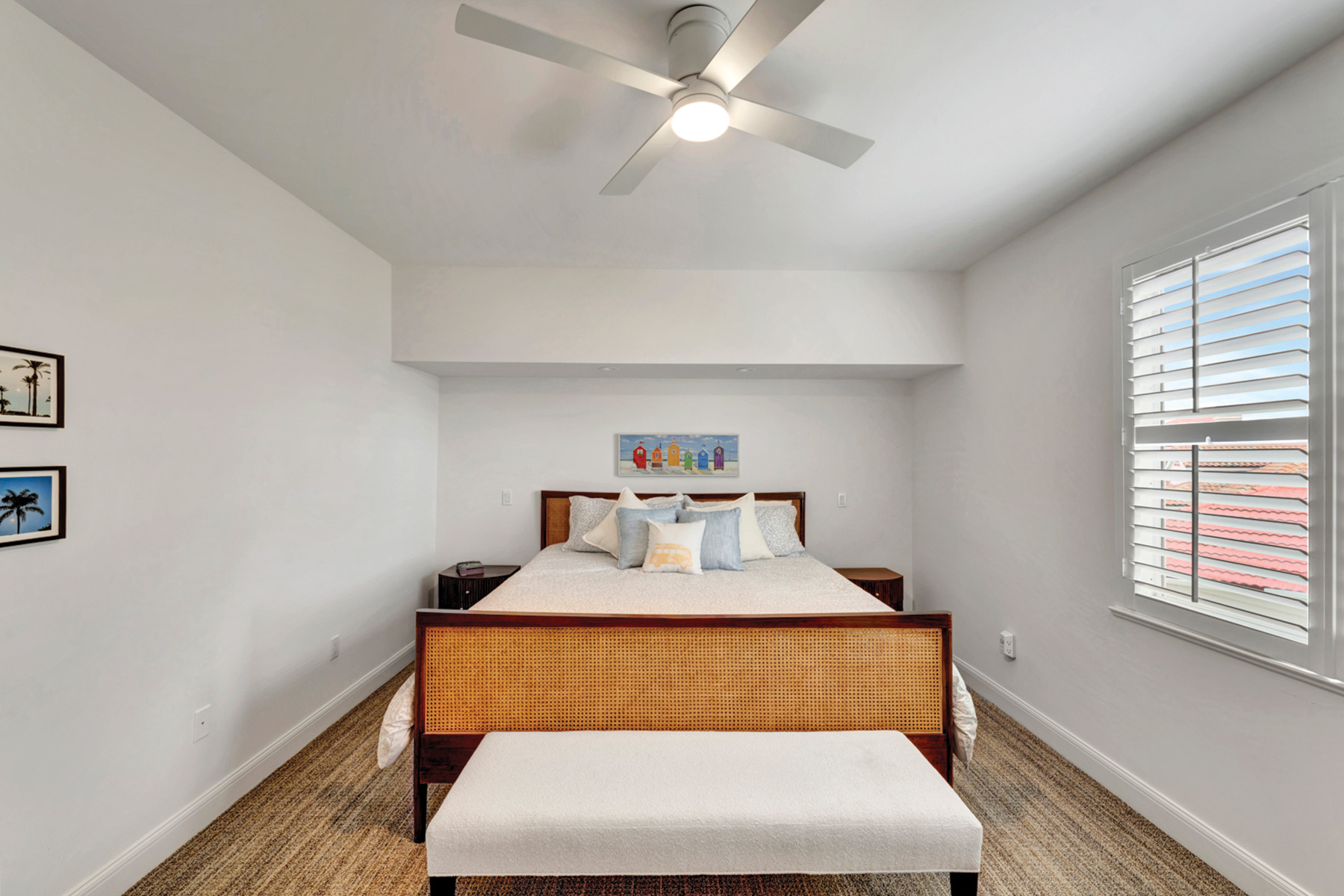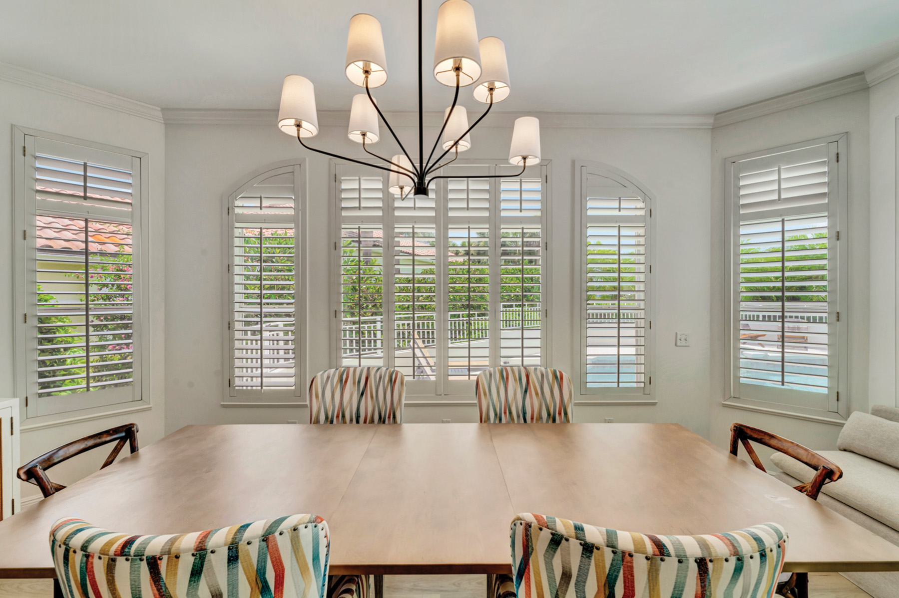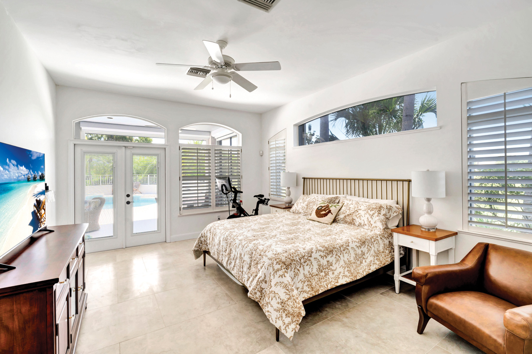 Accessed from the foyer, the home’s north “wing” is occupied solely by the primary suite, a roomy oasis of peace and quiet, with creamy porcelain tiled floors, enough space for a couple comfy chairs, a long, arched transom window high above the headboard, and a large, plantation-shuttered window on either side. Glass French doors with transoms and a wide window occupy the east/lanai side of the suite, so you can walk right out and jump into your beautiful pool for a bracing start to the day.