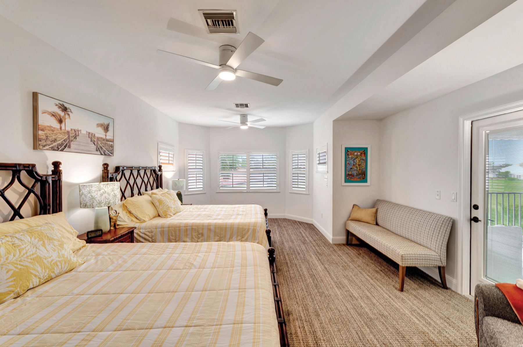 The front bedroom features a ceiling fan/light, two bifold closets and a full bathroom with tub/shower. With a large walk-in closet and spacious bay window, the 12-foot by 22-foot rear bedroom can be considered a second primary. It accesses the balcony, for gorgeous views and a private spot to relax. The ensuite bathroom offers shower, double basin vanity and loo.