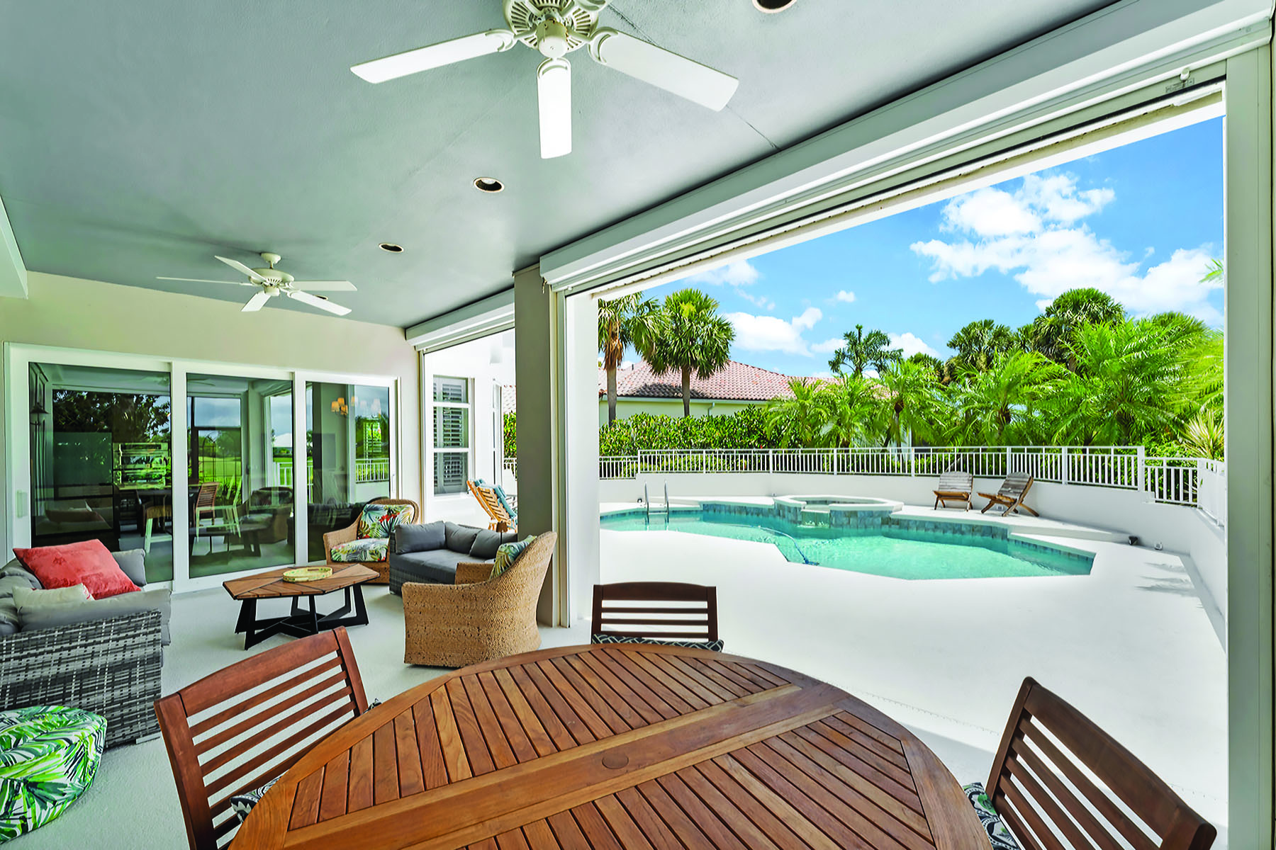 The lanai is open to the home’s private pool patio, swimming pool and spa.