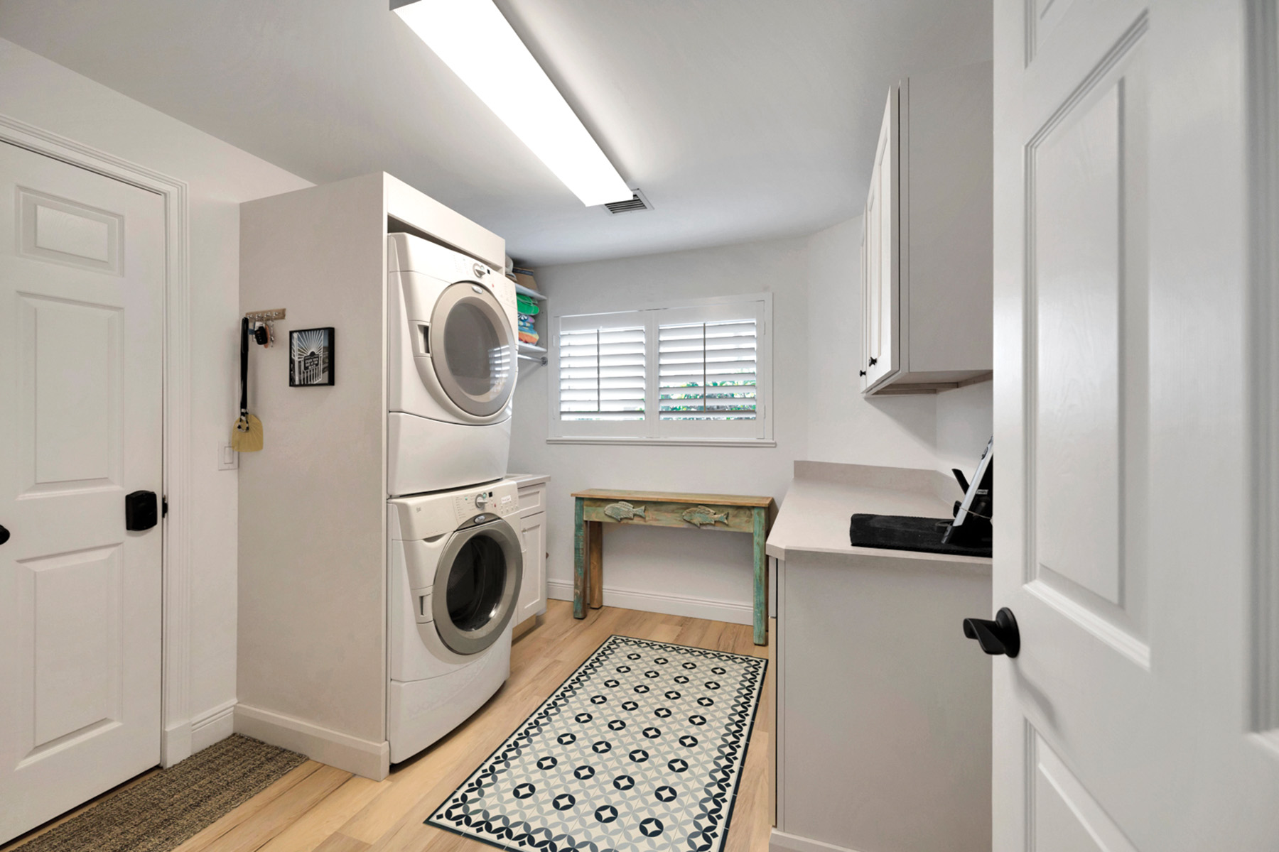 Rounding out the main floor on the south side is a powder room, and the laundry room, with stacked Whirlpool washer/dryer, sink, storage and window. The laundry room leads into a handy storage space and the only three-car garage in Coventry.