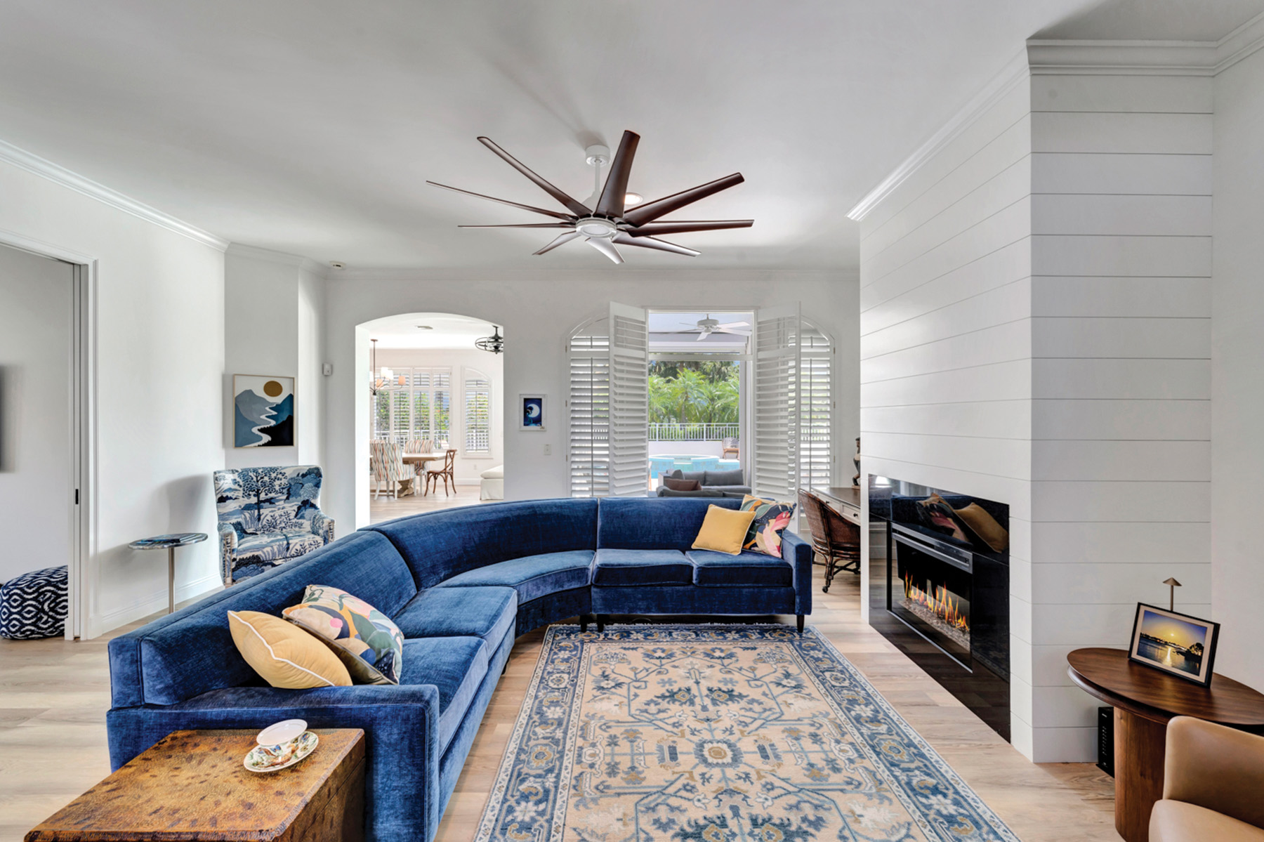 Another handsome feature of the living room is the simple black electric fireplace, a sophisticated stand-out within a new full-wall, white shiplap surround.