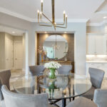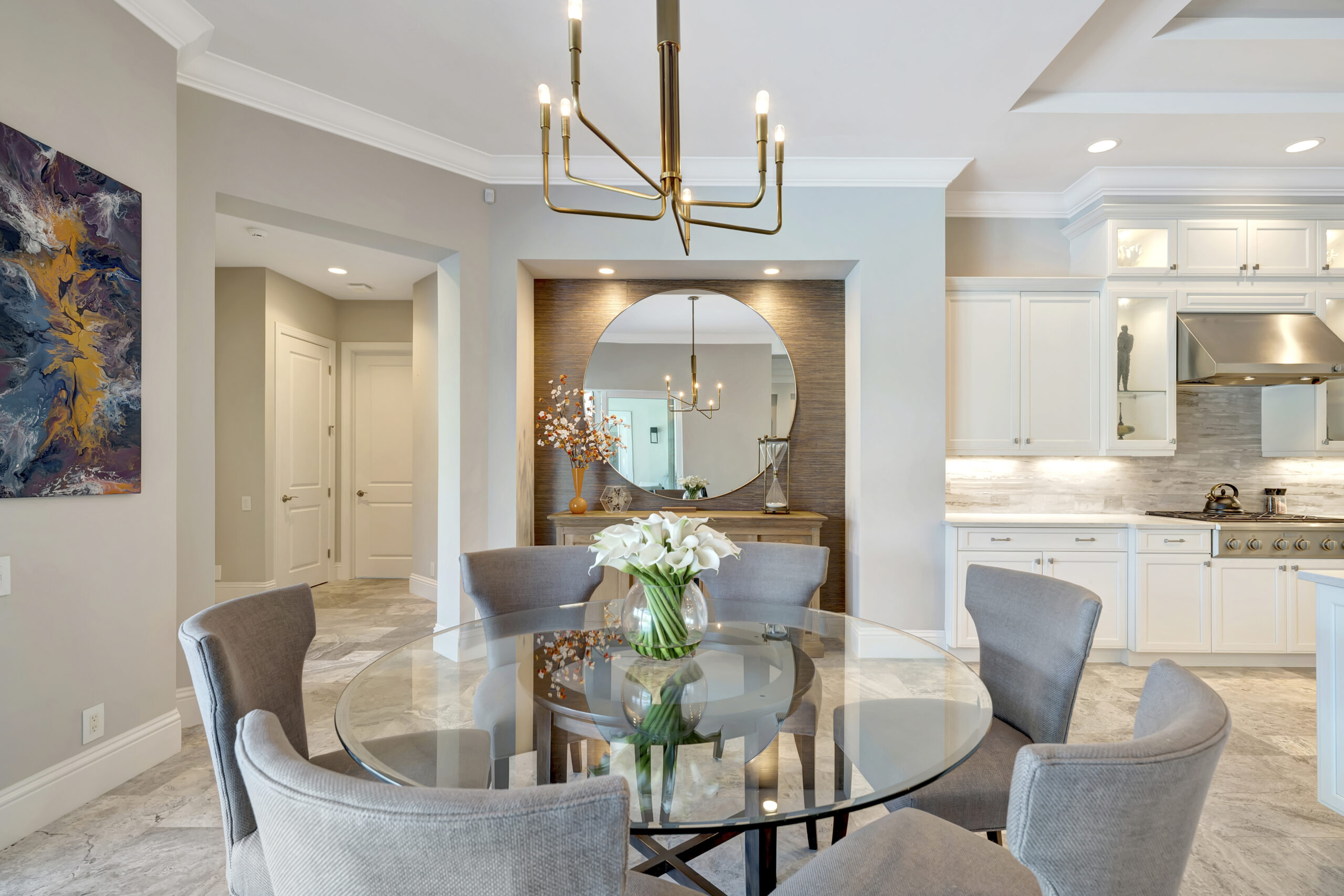 Corner seamless sliding-glass doors open onto the lanai and create a harmonious indoor-outdoor flow to and from the dining room.