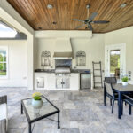 With the sliding-glass doors tucked out of the way, the great room opens to the screened lanai with its summer kitchen, dining area and covered seating area, providing an all-season outdoor room with lots of options for outdoor cooking and entertaining.