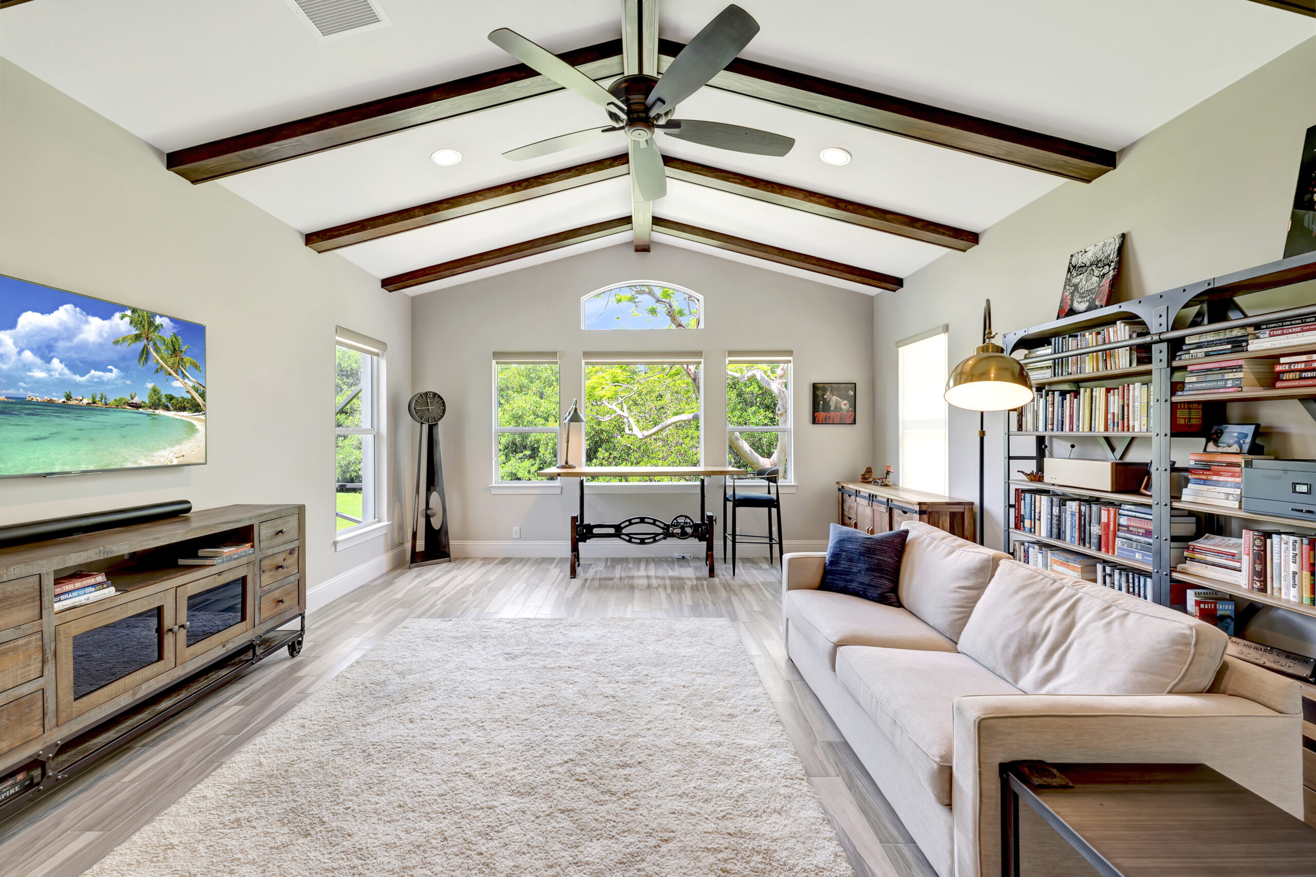 At the rear of the house, the multipurpose room overlooks the preserve through a trio of windows set beneath a beamed, vaulted ceiling. This versatile space is perfect as a second family room or a quiet retreat for guests. The closet and proximity to the pool bath allow for its use as an additional bedroom as needed.