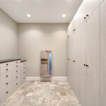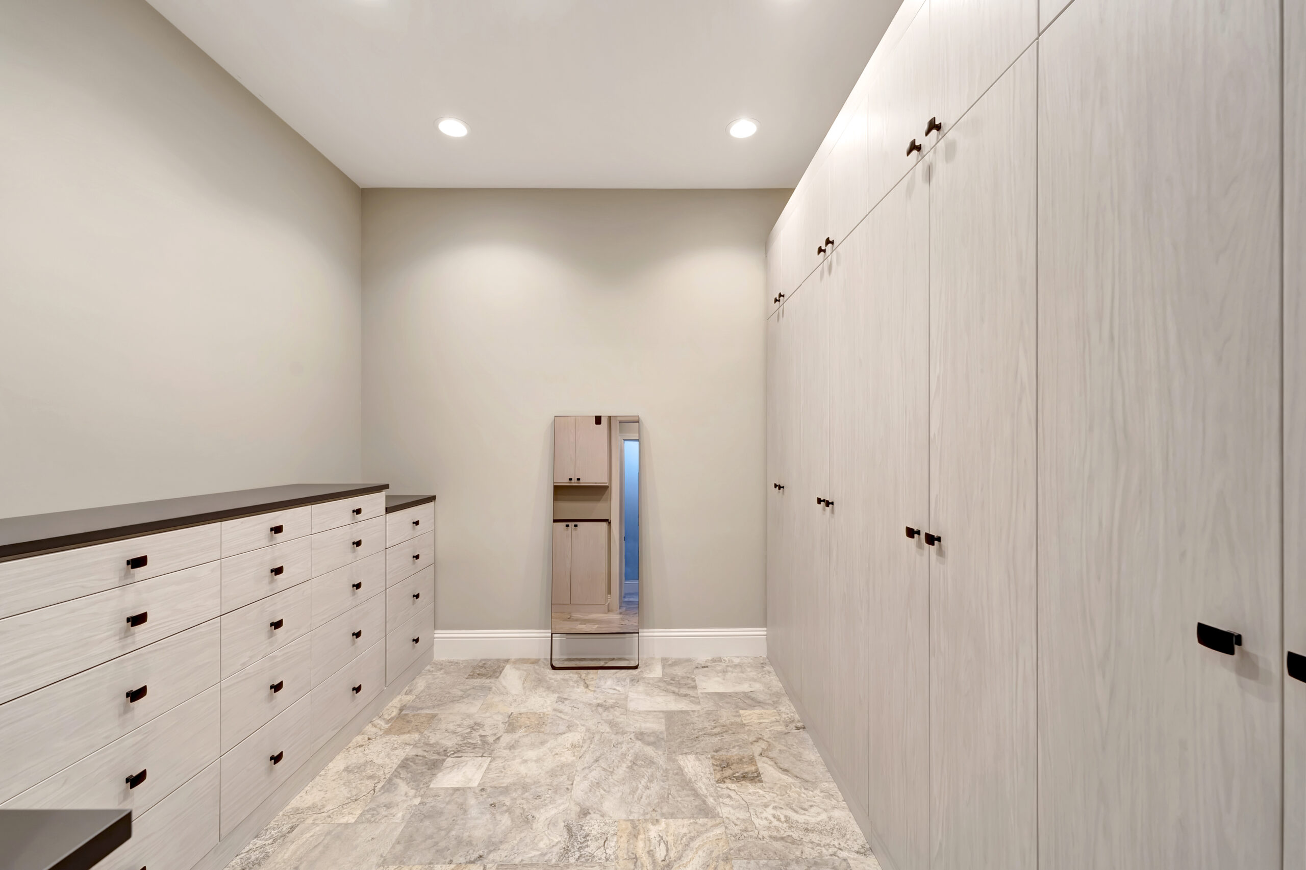 The primary suite and a den in the southern wing provide complete privacy for the owners. The generously sized bedroom enjoys lovely views of the pool and preserve, and private access to the pool. The spacious walk-in closets have custom cabinets and shelving, providing a place for everything.