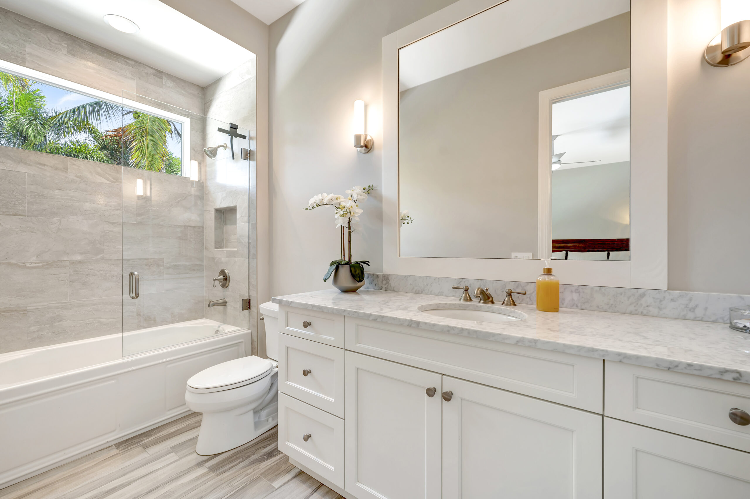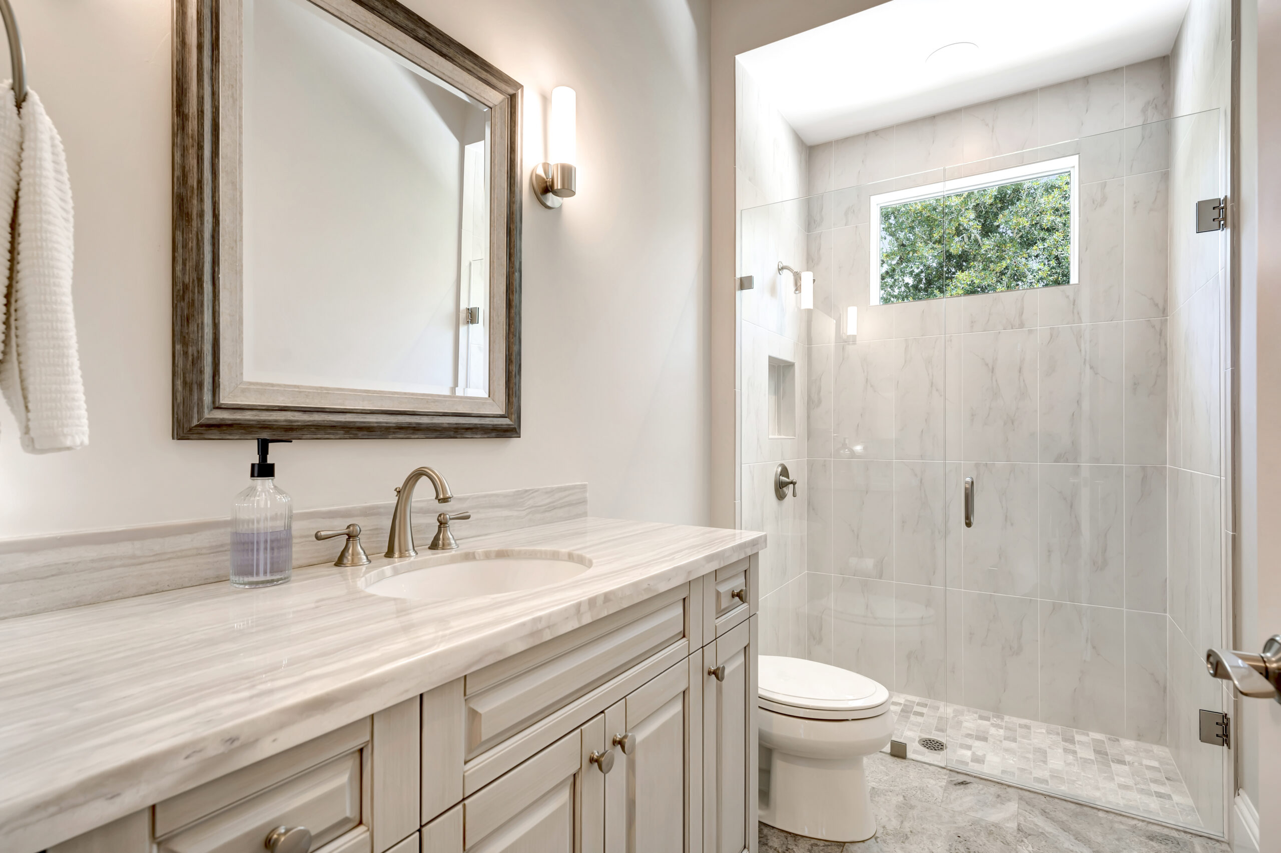 The elegantly appointed bath has a glass-enclosed shower with dual shower heads, a jetted tub, double sinks with marble countertops and a water closet. The adjacent den includes a closet, making it a functional flex space for overflow guests.