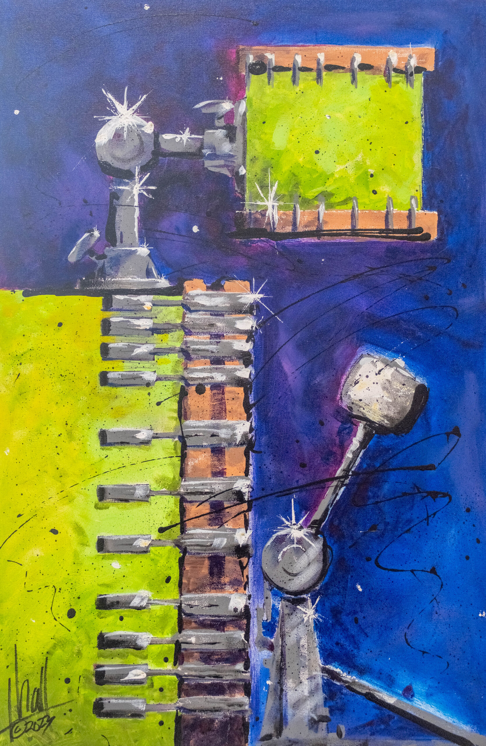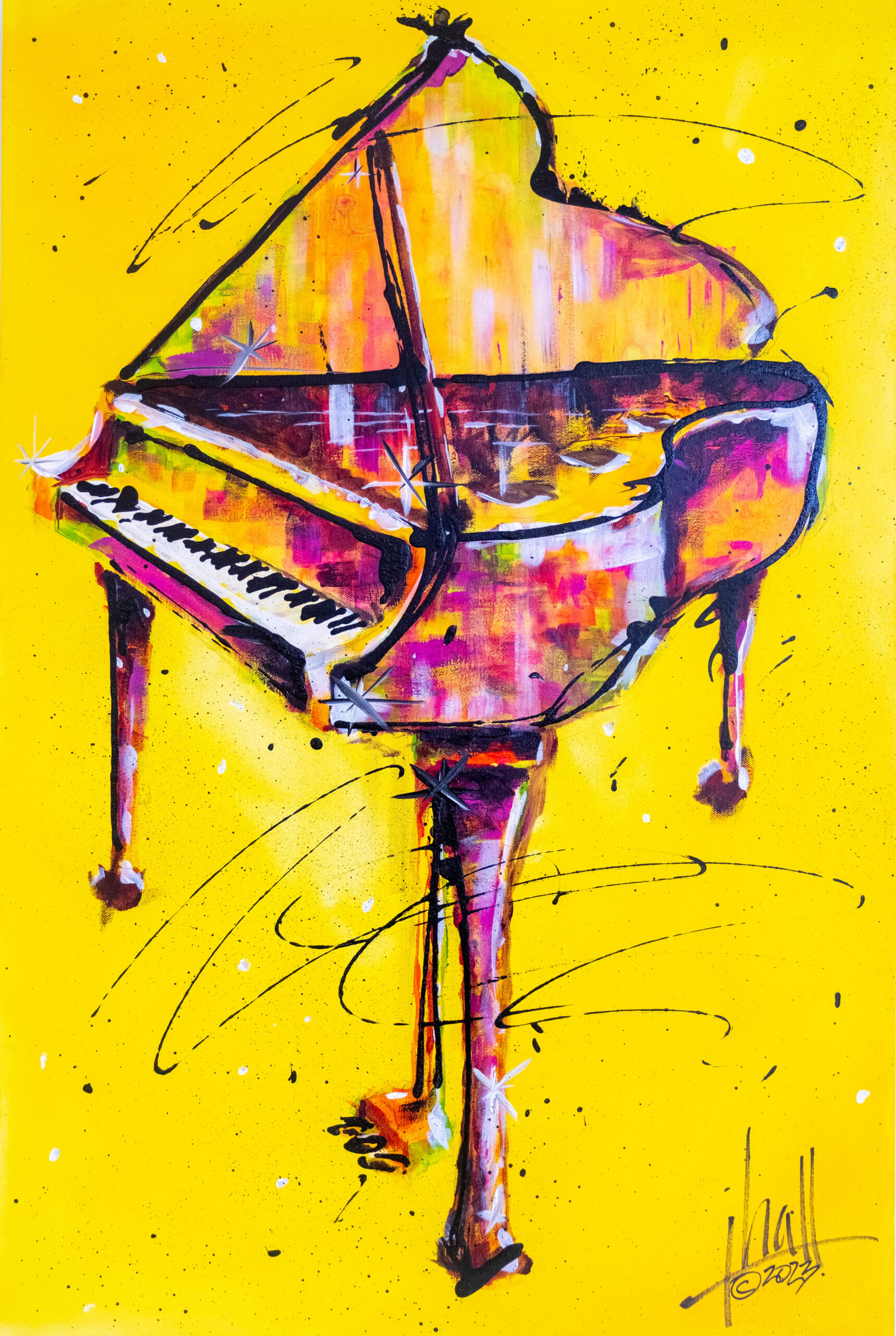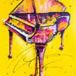 His abstract and semi-abstract acrylic paintings are immersed in music and architecture, such as his piece ‘Yellow Piano,’ with its flawlessly detailed piano keys. The curves of the wood and swirls of the piano legs are as intoxicating as a cocktail.