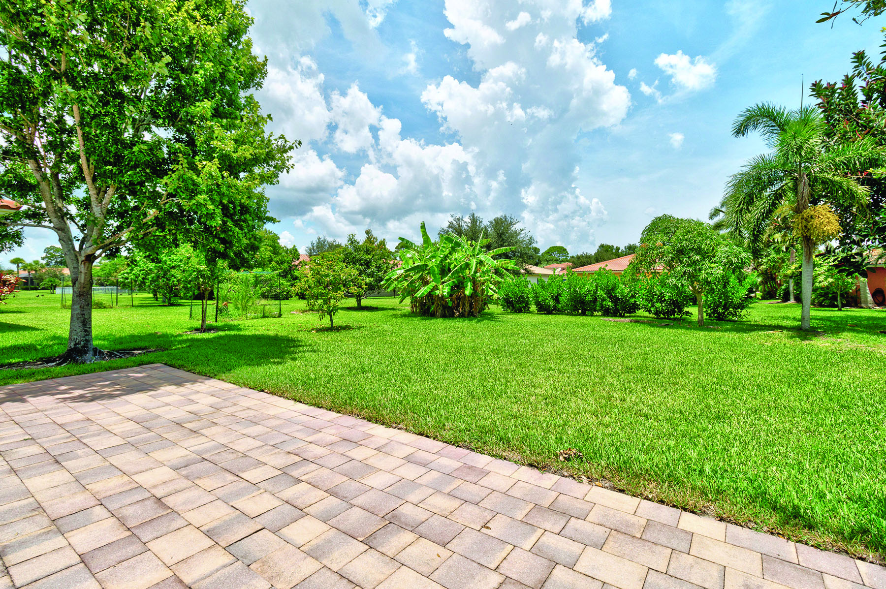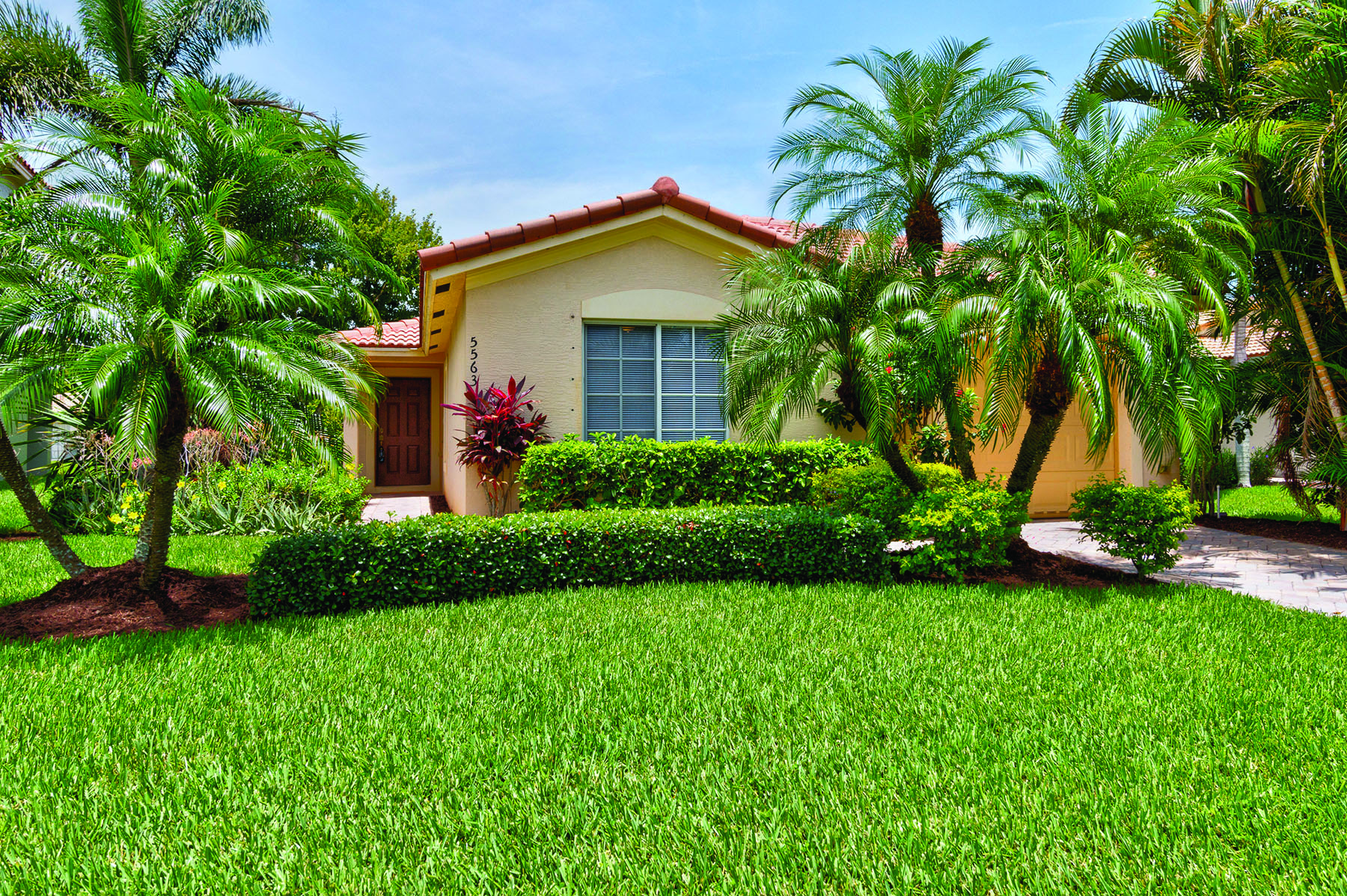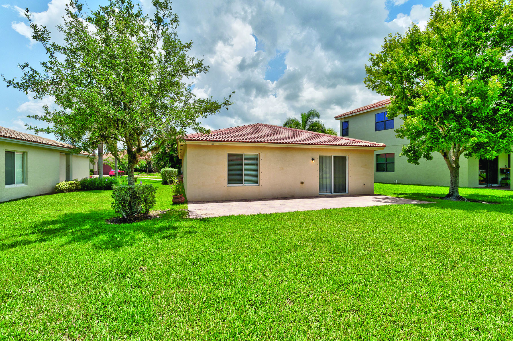 The house has loads of curb appeal with soft, sunny yellow walls, mullioned front window, and a red, barrel-tile roof – all framed by the tropical landscaping Vero Lago is known for.