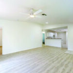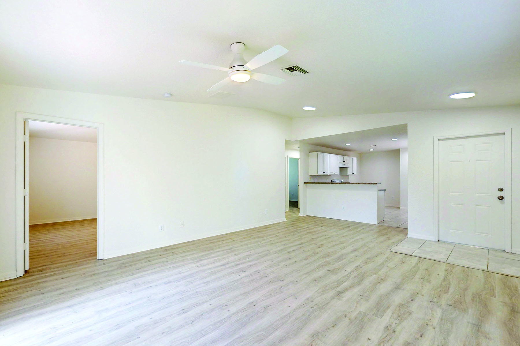 Throughout the home, the white-on-white palette, new recessed lighting, wide windows with new blinds, and the new, neutral vinyl flooring contribute to a pleasant, airy feeling of light and space.