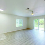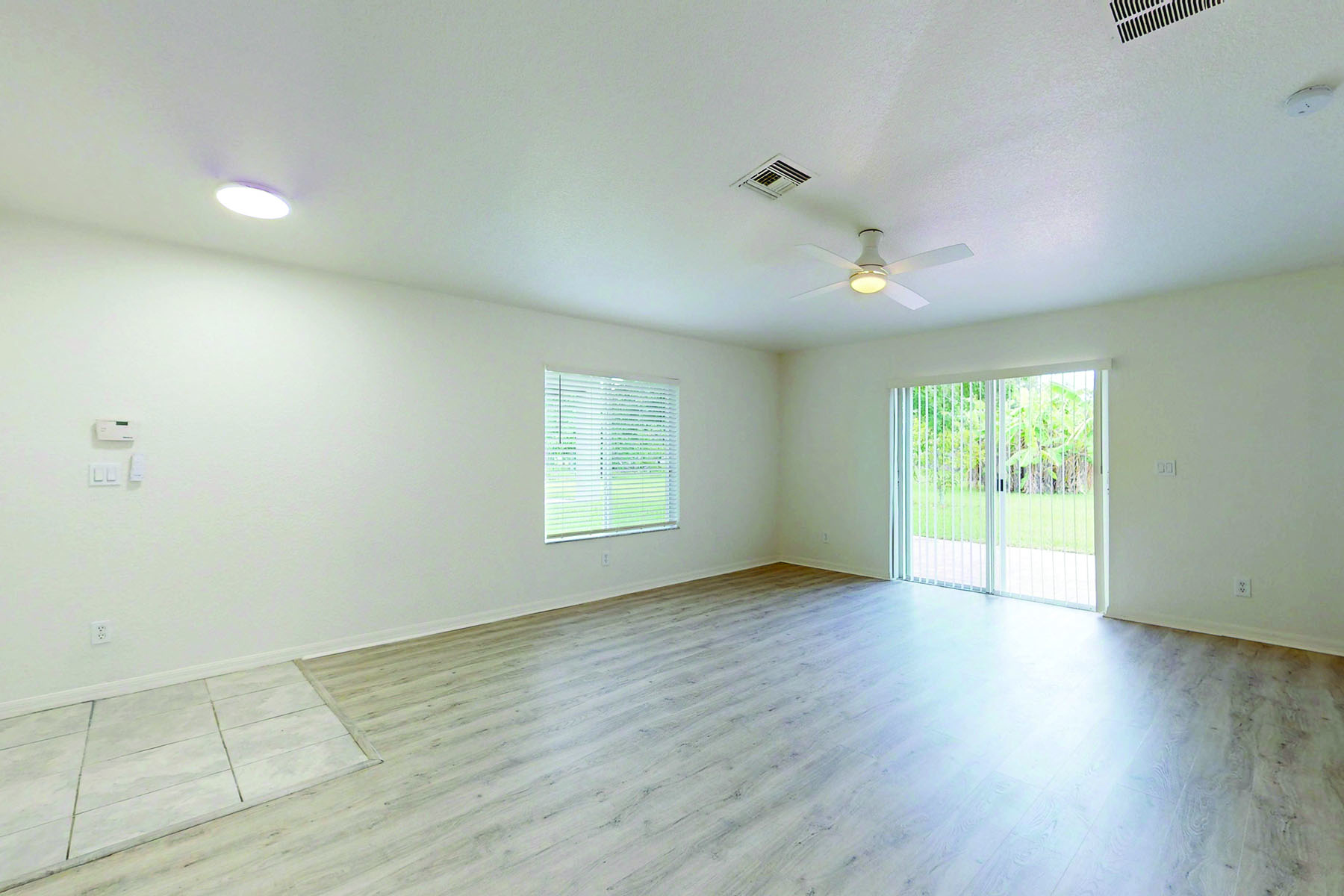 Past a ceramic tile entry “pad,” a vaulted ceiling soars, and pale wood-plank vinyl flooring flows throughout the living/dining space. On the far wall, glass sliders open onto the long back patio, thick lawn and robust foliage, offering a pleasant, green view as well as plenty of space for children’s playtime, gardening or lawn chair relaxing. You could even install a pool if desired.