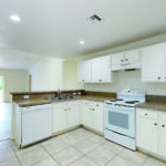 The handsome, L-shaped open kitchen features neutral ceramic tile flooring, white cabinetry and cream/black/brown mottled granite countertop and backsplash. There’s a new white dishwasher and white electric range. A two-level counter separates the living room from the kitchen, with double-basin, stainless-steel sink on the kitchen side and lunch counter on the living room side.