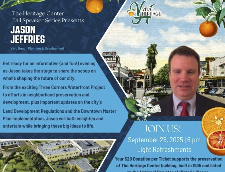 The Vero Heritage Speaker Series will present Jason Jeffries, Vero Beach planning and development director, Thursday evening, Sept. 25. The series is designed for those interested in learning more about the community, its history and its growth. Jeffries’ role in guiding planning and development in Vero Beach provides insight into how the city continues to evolve while balancing preservation with progress. Tickets are $20. The program begins 6 p.m. at the Heritage Center, 2140 14th Ave. For more information call 772-770-2263 or visit VeroHeritage.org.
