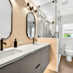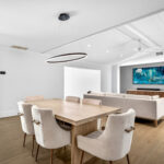 A modern circle chandelier defines the dining room, which opens to a chef’s kitchen delineated by a polished quartz waterfall island with seating and storage. The clean, contemporary aesthetic is carried through with the handle-less cabinetry, featuring electronic-button upper cabinets and a hidden appliance garage. Ready for any culinary challenge, the kitchen is equipped with high-end appliances, from a pot filler to double ovens, one of which serves as a combination microwave and air fryer.