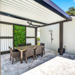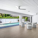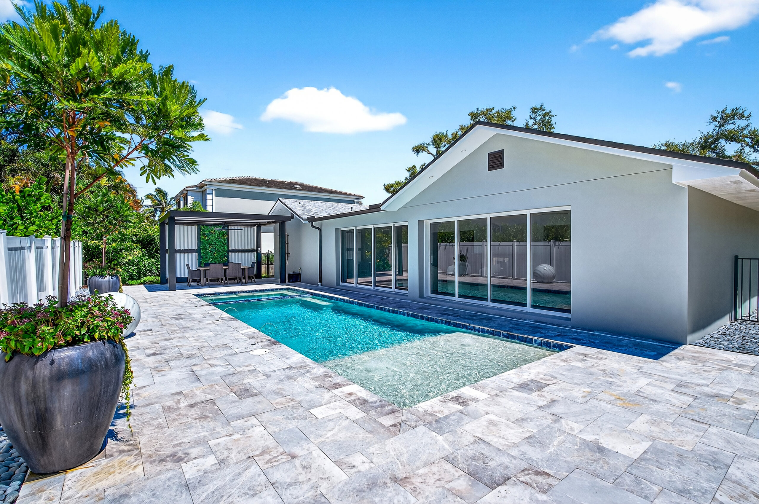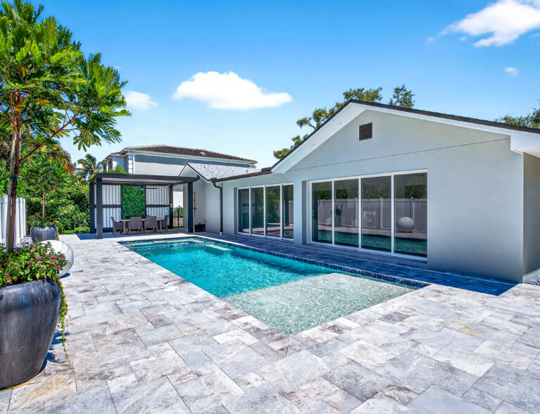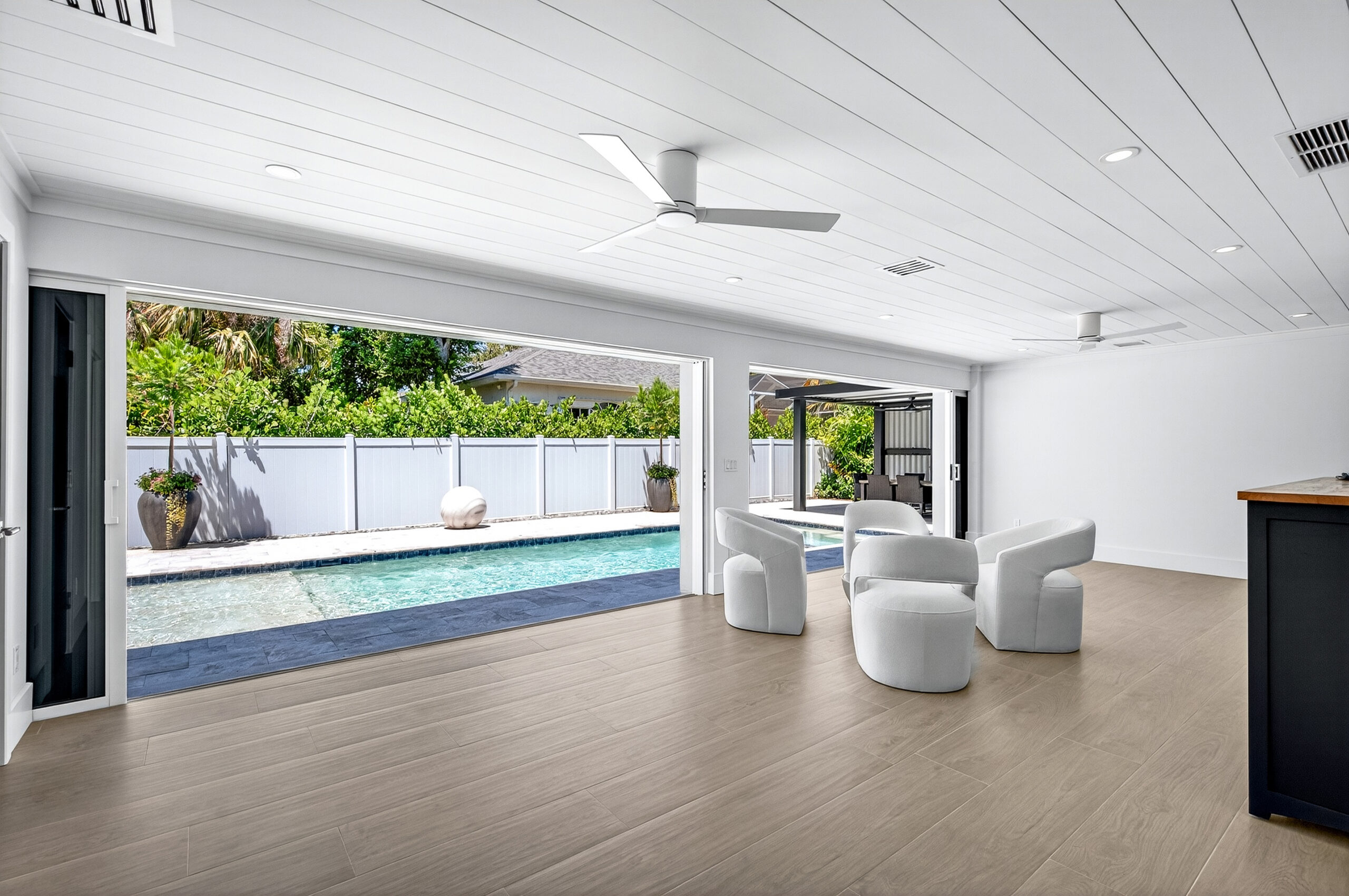 An enclosed sunroom spans the rear of the house with a wall of stacked sliding glass doors that glide back out of sight, fully opening the main living area to the outdoor oasis.