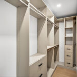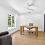 The remainder of this wing includes the laundry room, a two-car garage with an epoxy floor and EV charging station. Near the front entry, Johnson repurposed the former dining room into a guest bedroom by adding a closet. The room is currently set up as an office, where custom barn doors allow for flexible use of the space.