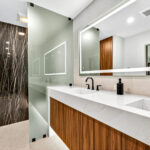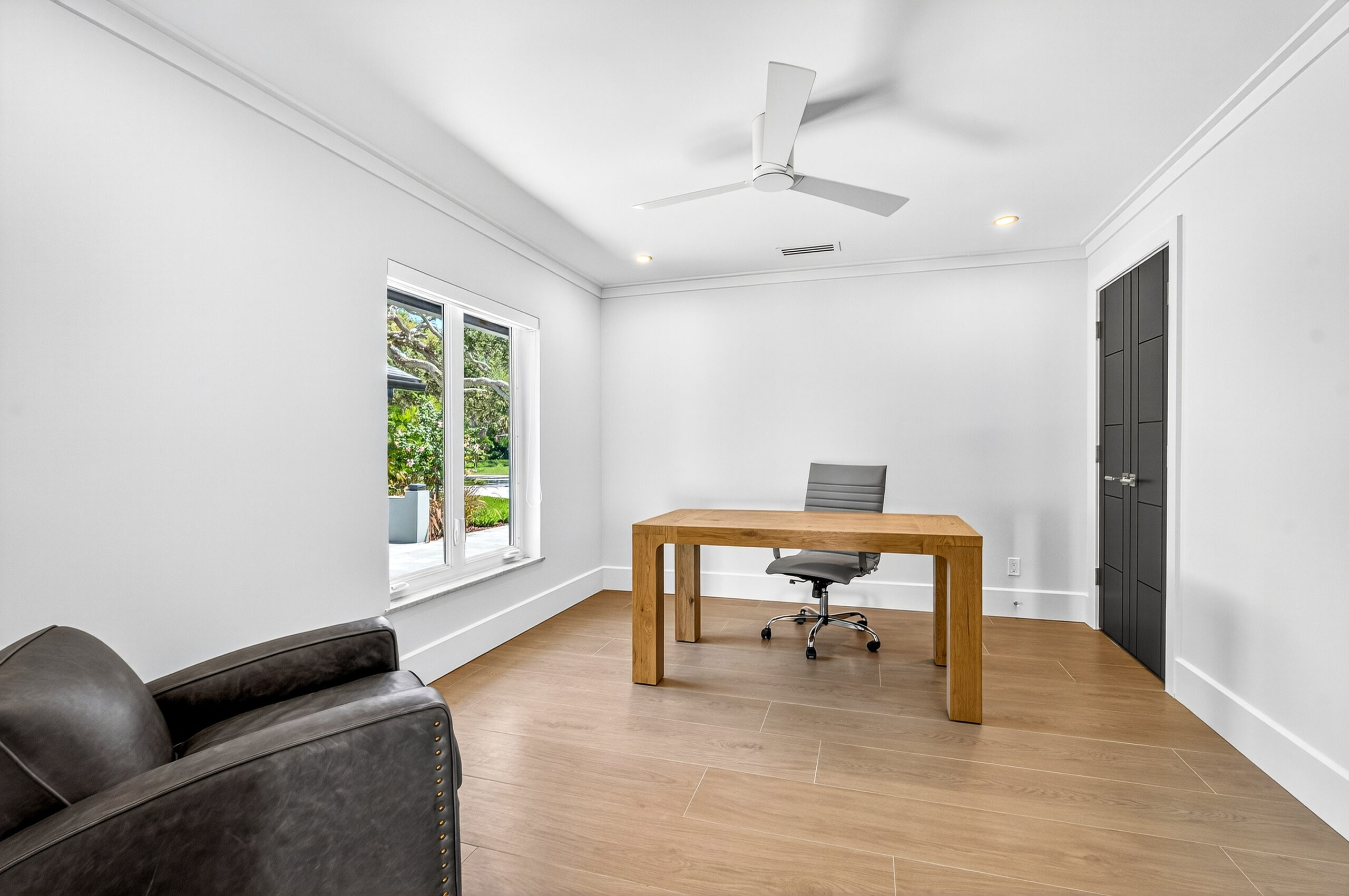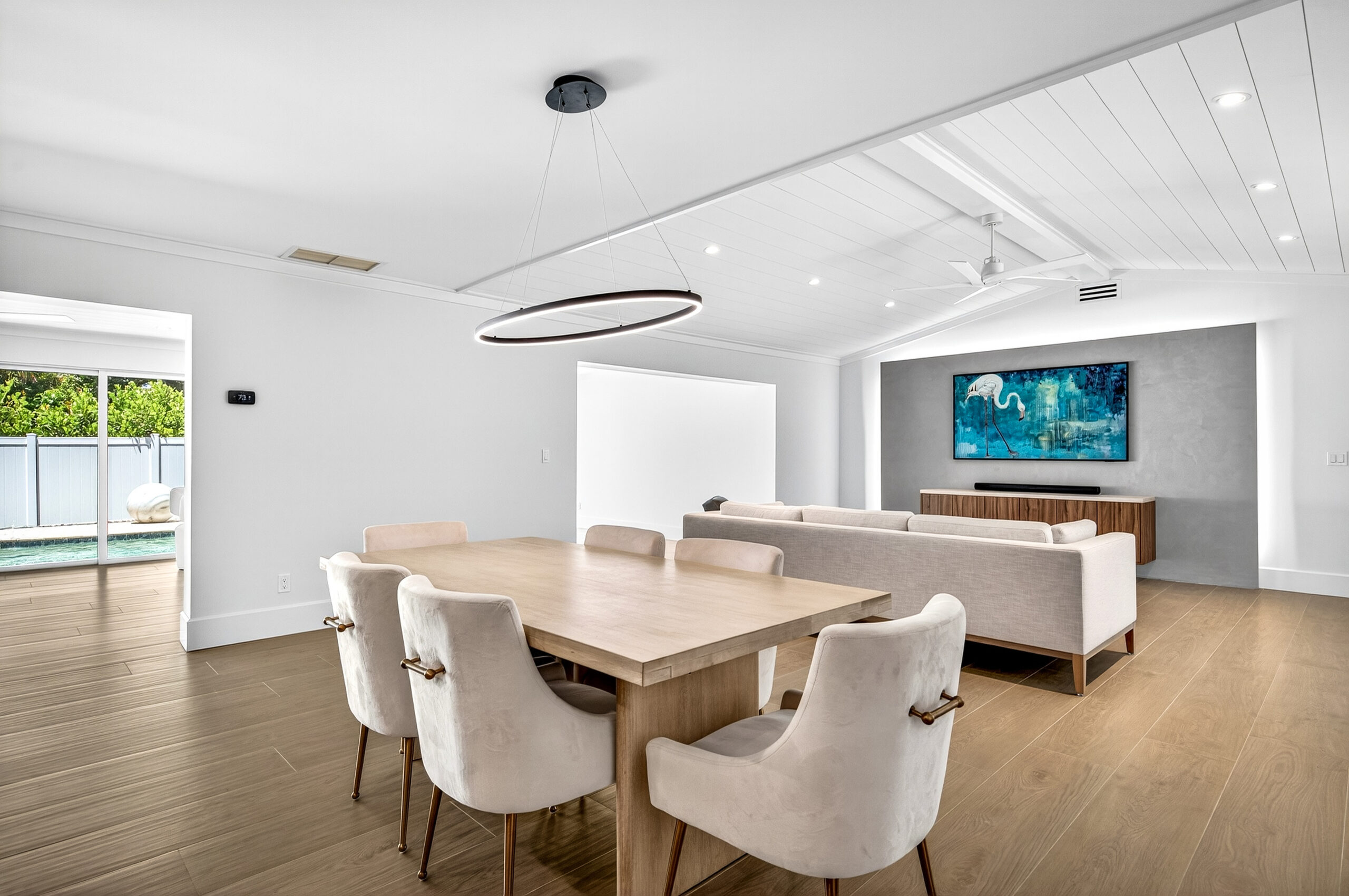 Even from the curb, the residence signals a departure from the ordinary with a black anodized full-view garage door complemented by a five-lite wood front door with clean geometry that offers a welcoming, contemporary touch. Together, these elements hint at the meticulous attention to detail and the fusion of modern aesthetics and natural, inviting warmth that await within.
