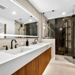The primary suite has a hidden shoe closet, a large walk-in closet, and a spa-like bath featuring a double vanity, a frosted glass toilet room divider, a double shower backed by a dramatic backlit slab of black marble, and a smart mirror.