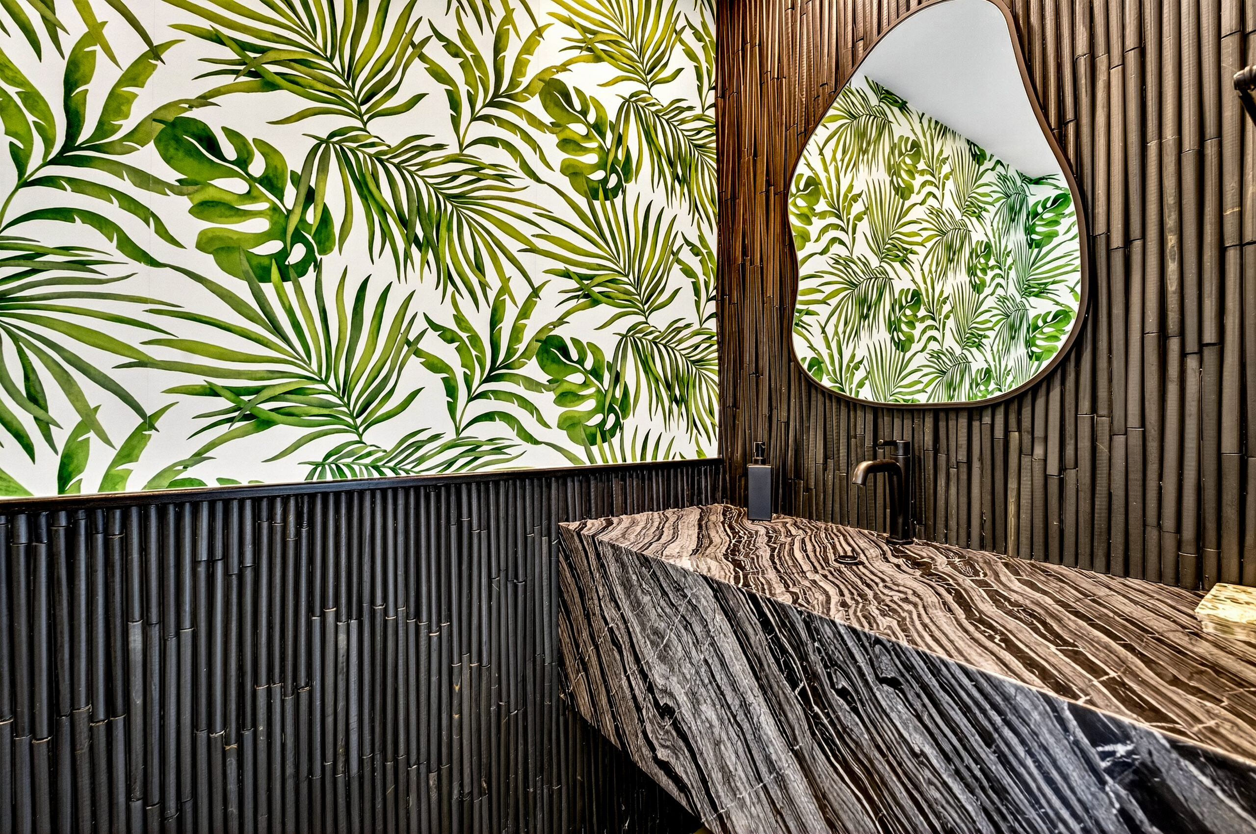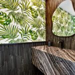A built-in bar with a refrigerator adds a touch of elegance to this transitional indoor-outdoor living space, while a storage closet and powder room increase functionality. The powder room complements the indoor-outdoor experience with fern accents against stone bamboo wainscoting. A marble infinity sink appears to defy gravity as the water vanishes into the basin-less structure.