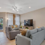 The central gathering area is currently configured as a cozy living room and dining room, with a glass door opening to the lanai.