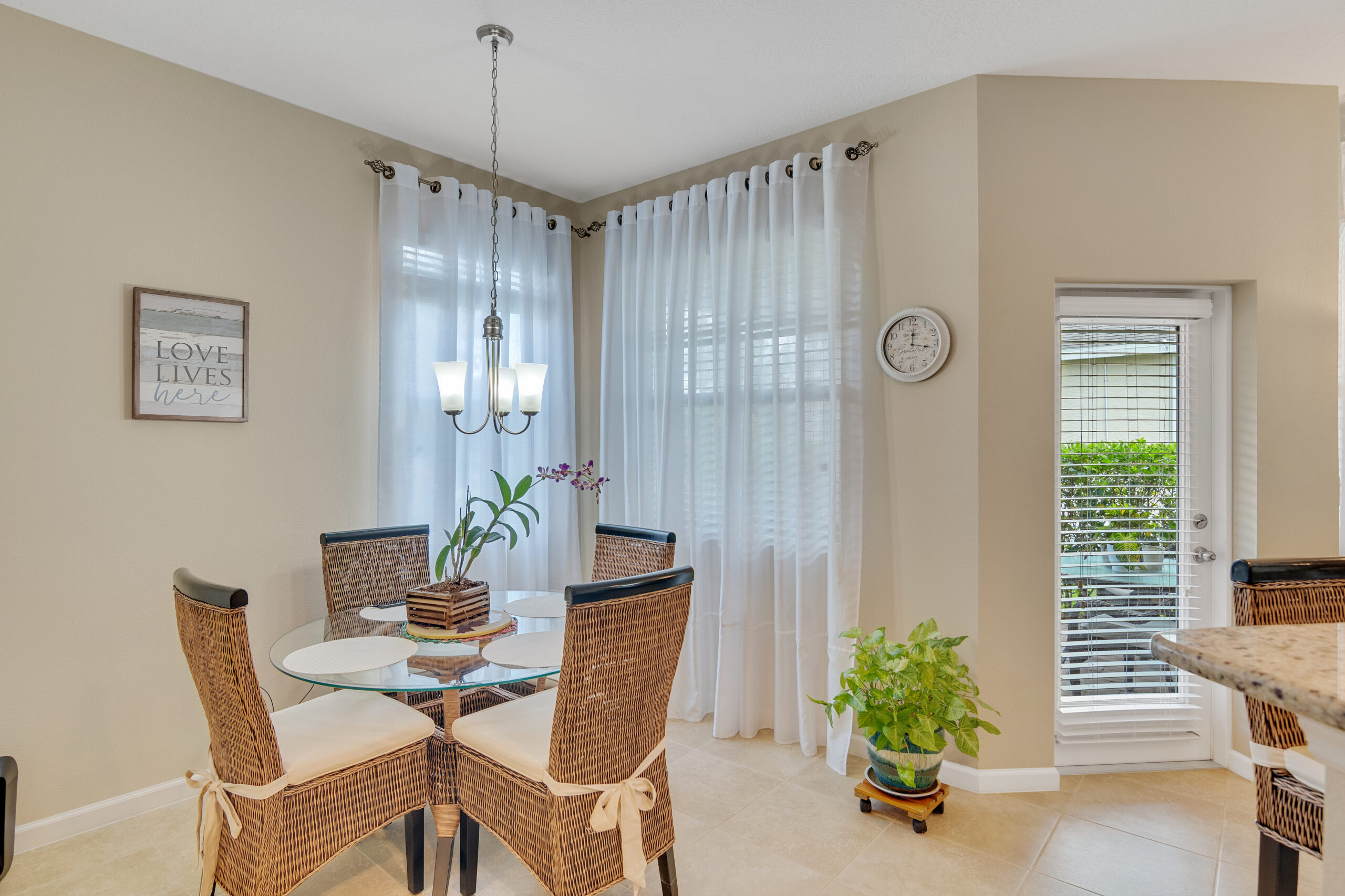 A glass door opens from the kitchen onto the charming lanai, surrounded by the verdant, colorful landscaping that embraces the home’s perimeter. From the kitchen, a pair of windows in the corner of the sunny breakfast nook provide ambient light and a pleasant green view.
