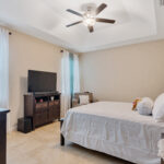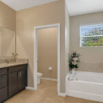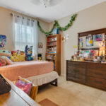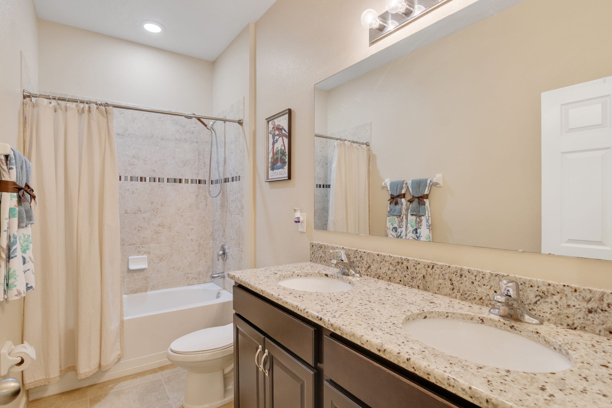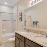 The three guest bedrooms are at the front of the house, on either side of the foyer. Each has a double bi-fold closet, and they share a full bathroom, which doubles as the guest bath/powder room, offering tub/shower, double-basin sink and loo.