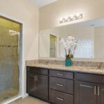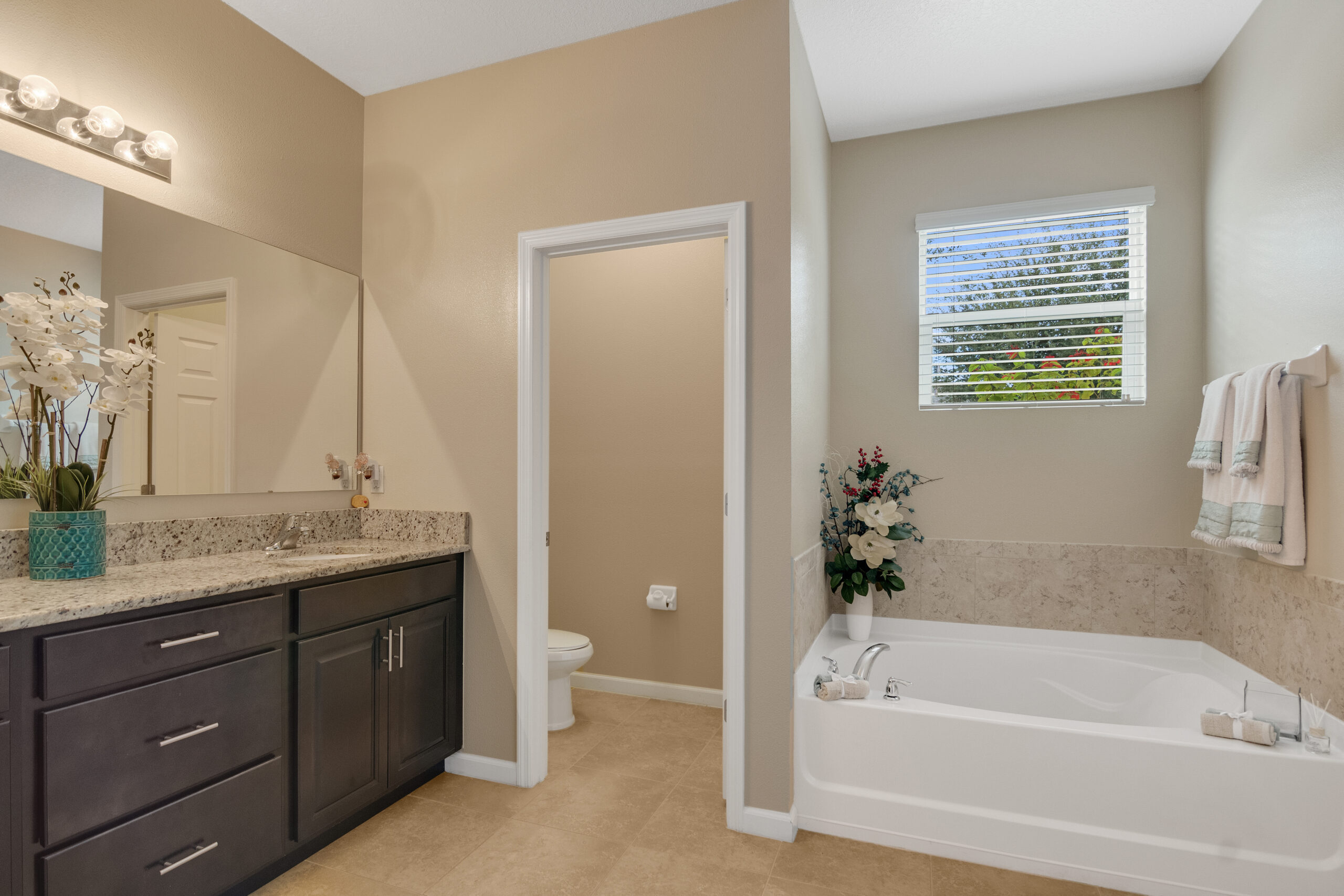 A granite-topped, dark wood vanity with double-oval sink, full length mirror and marquee lights, and a water closet complete this indulgent space.