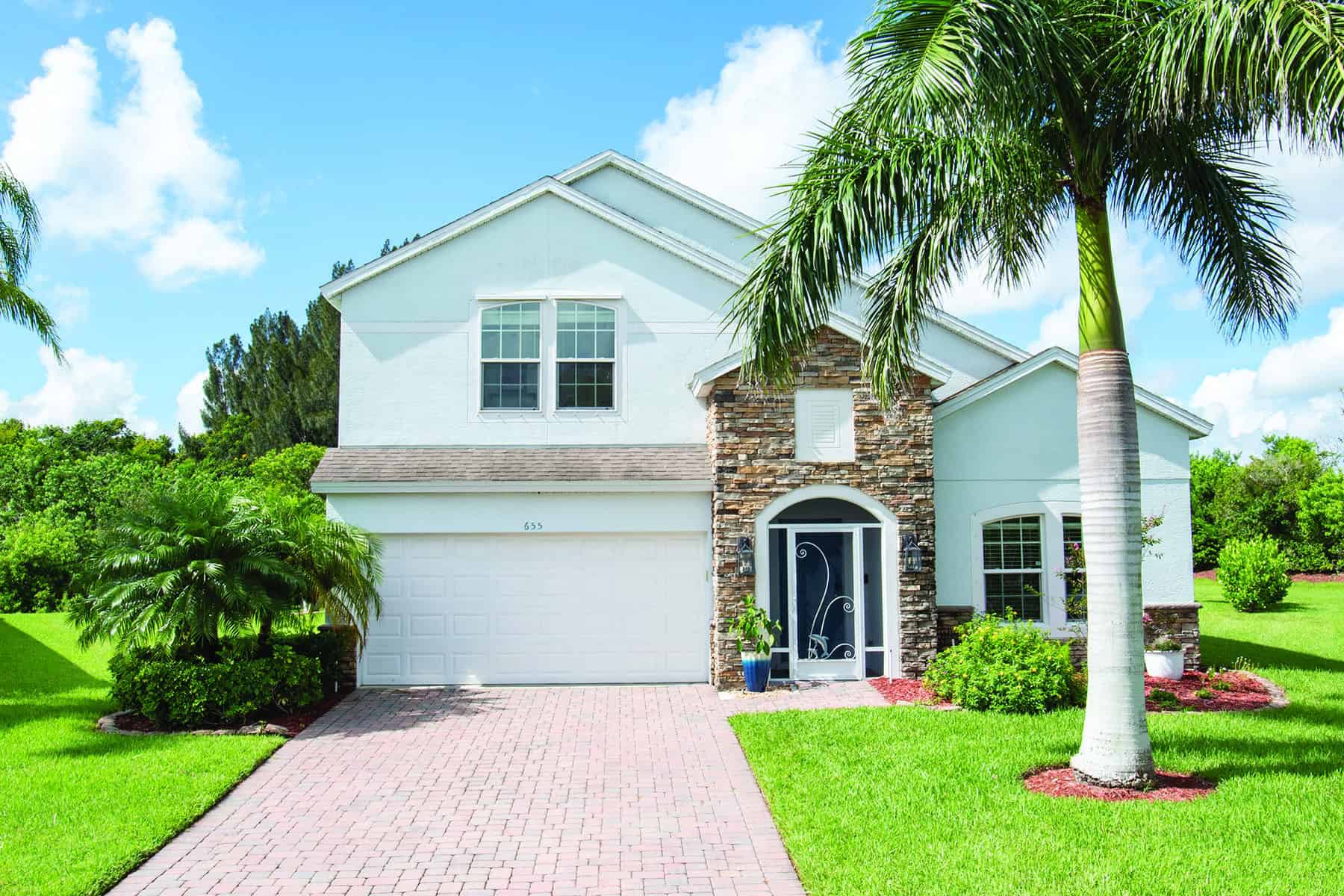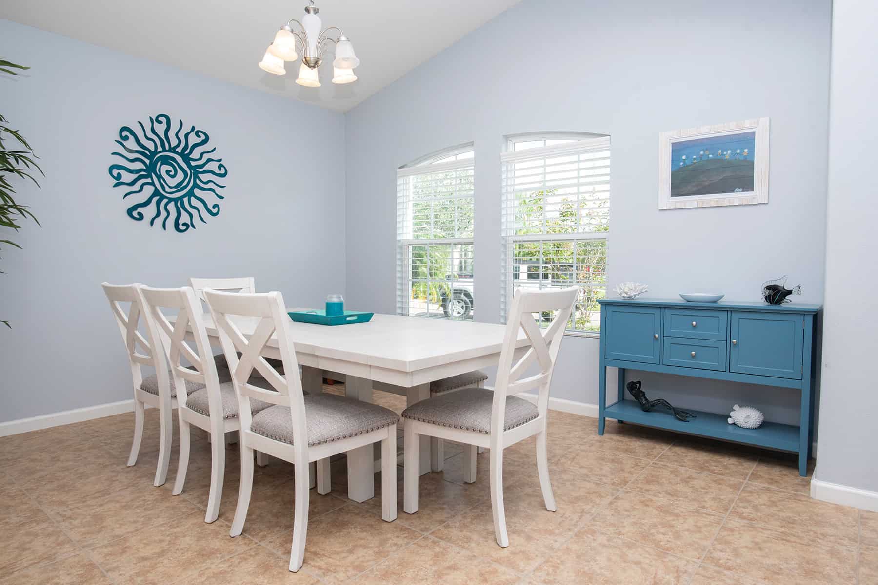 Inside, sand-hued ceramic tile stretches throughout the home’s central spaces, while a carpeted staircase leads from the foyer to the second-level guest bedrooms.