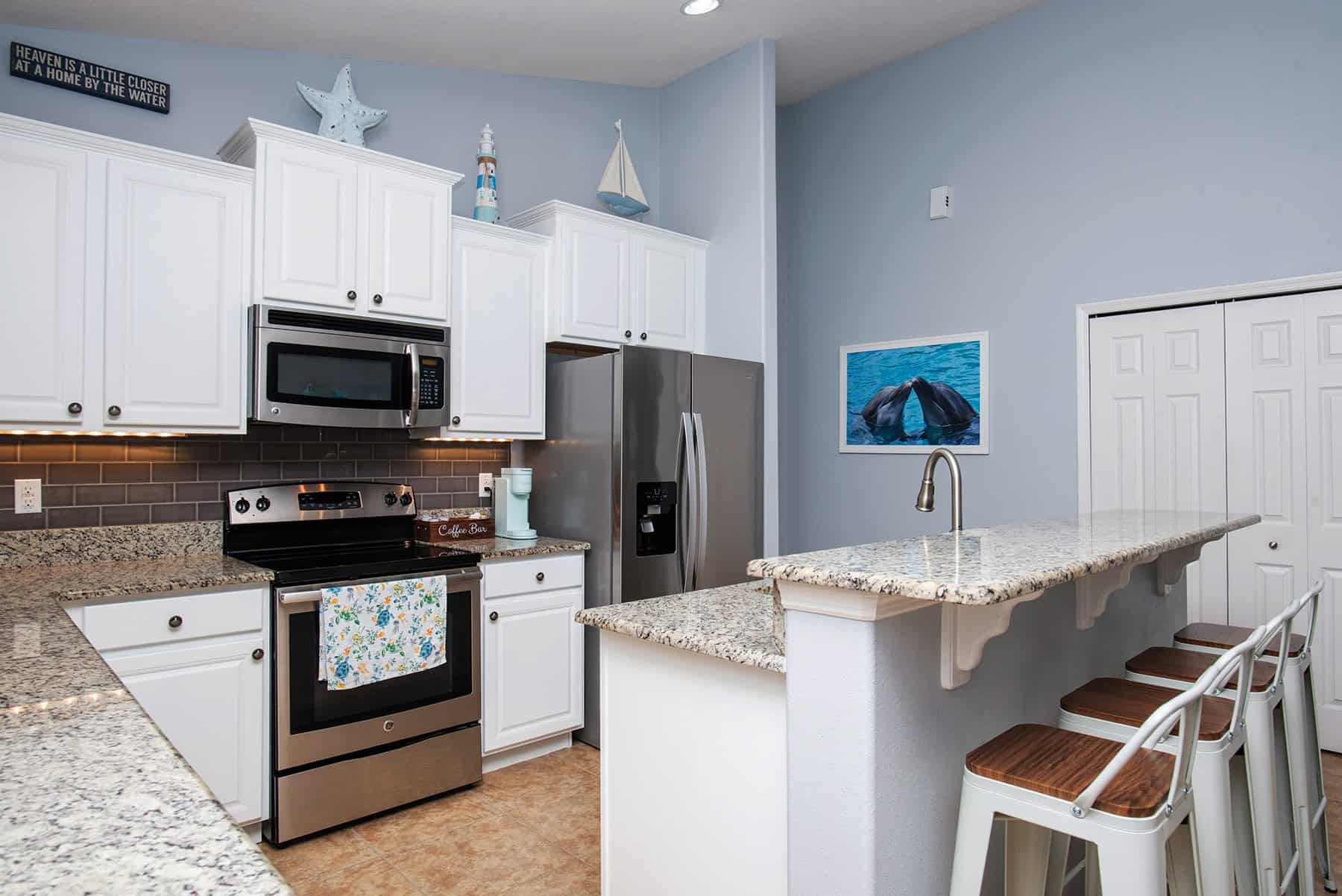 The kitchen is a tidy and efficient beauty, illuminated by both under-cabinet and recessed lighting. It features cream/black mottled granite countertops, white shelf-top cabinetry with crown molding, gray subway tile splash, range, dishwasher, built-in microwave, and water-in-door fridge. Facing the breakfast/gathering space, a two-level counter contains a stainless steel, two-basin sink, storage, and four-stool snack bar.