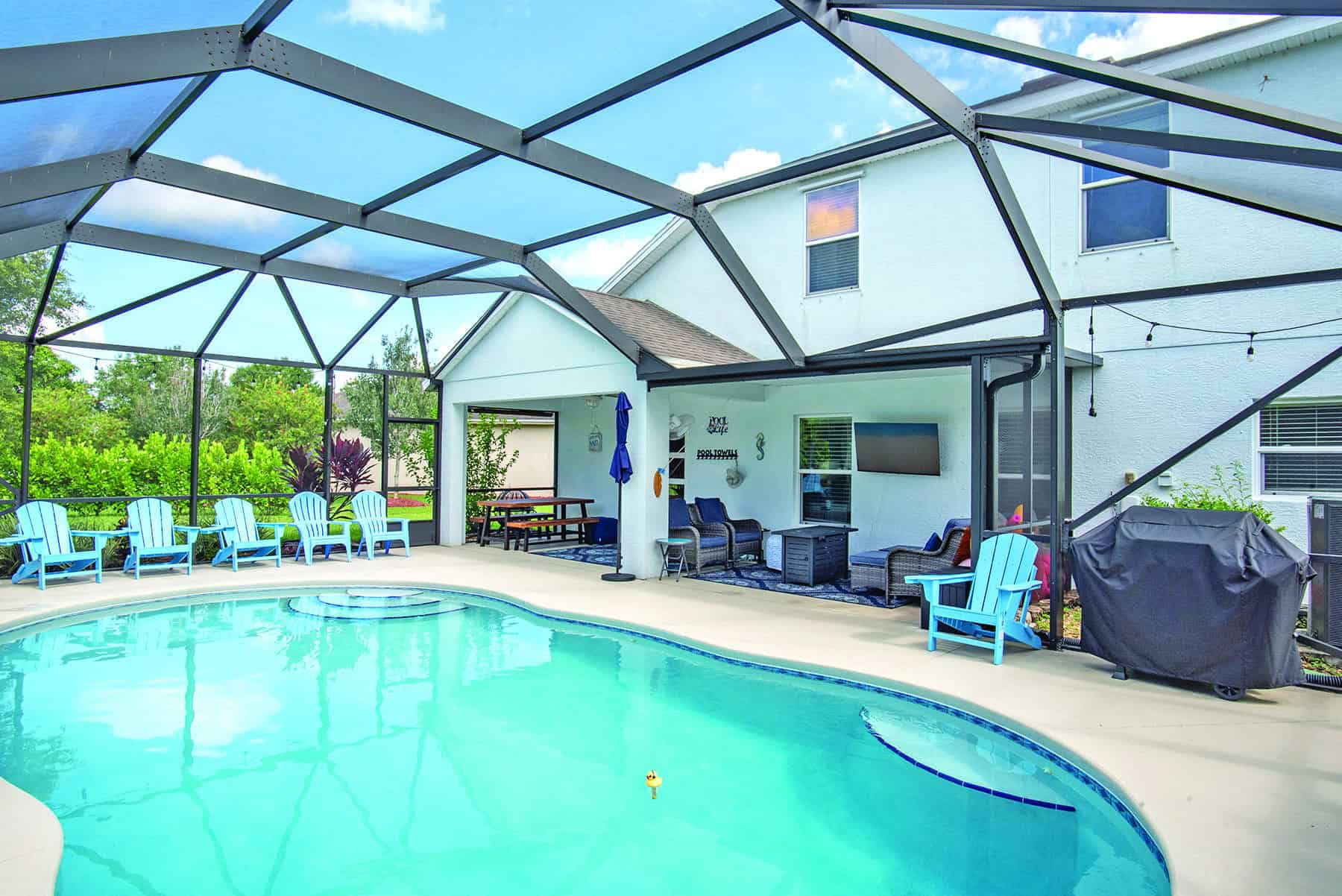 The long, beautiful lanai will likely be the home’s most popular gathering place, where you’ll want to spend as much discretionary time as possible. It opens to the screened pool deck and sparkling, free-form, heated, saltwater pool. With doors open, you have a fabulous indoor/outdoor space for entertaining. Beyond the screened pool, is a stretch of back lawn, perfect for romping with the family pooch, games of badminton or croquet, and so much more, all within the privacy provided by the surrounding vegetation, with no neighboring houses to the rear.