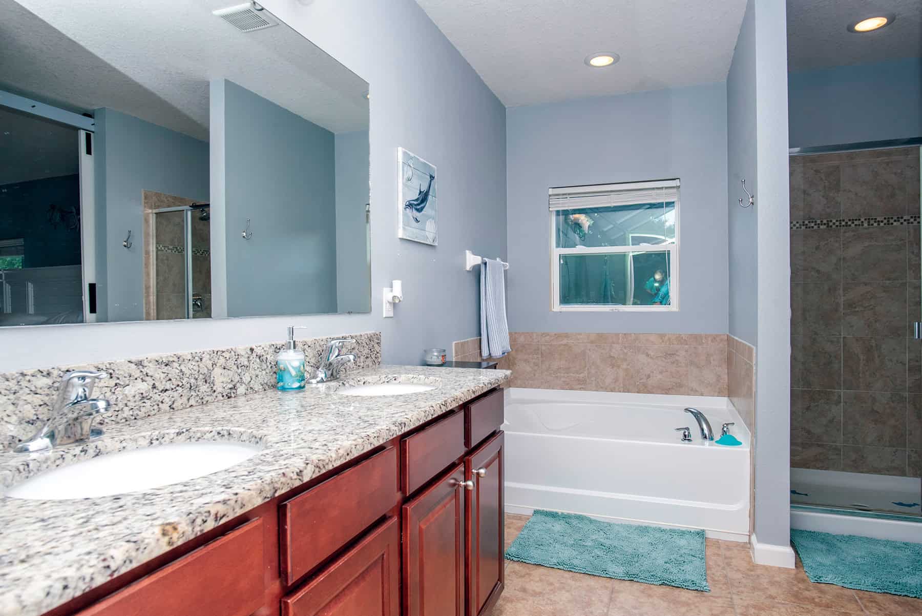 A simple and elegant white barn door with black hardware slides back to reveal the ensuite bathroom, where you’ll find tan-tiled, walk-in shower, gleaming white soaking tub, a two-oval recessed-basin vanity with warm wood cabinetry, granite countertop, four-tulip bulb strip lighting, and full width frameless mirror. A water closet with wall shelving completes the room.