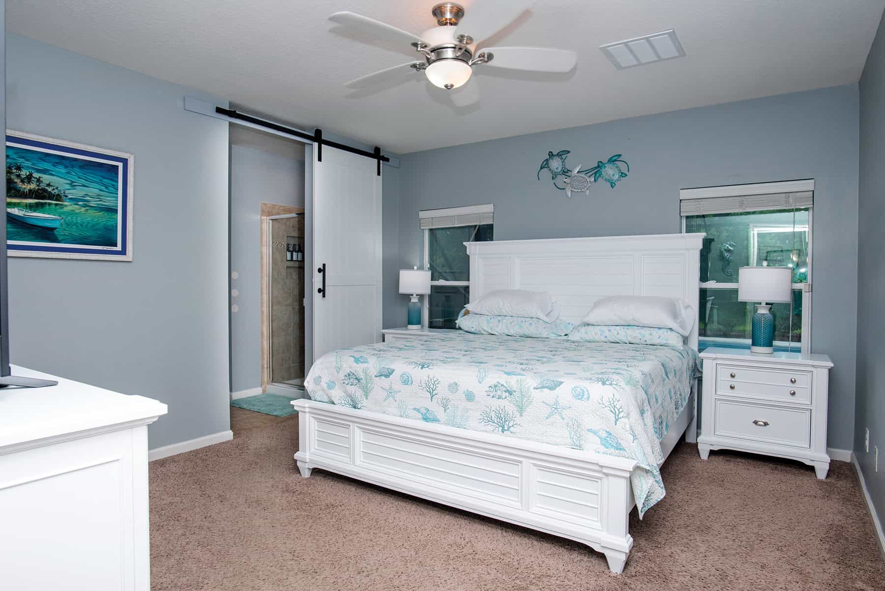 From the central space, the primary suite sits in the home’s southeast corner, a serene retreat with soft gray walls, white furniture and trim, white ceiling fan/light and soft, sand-hued carpet.