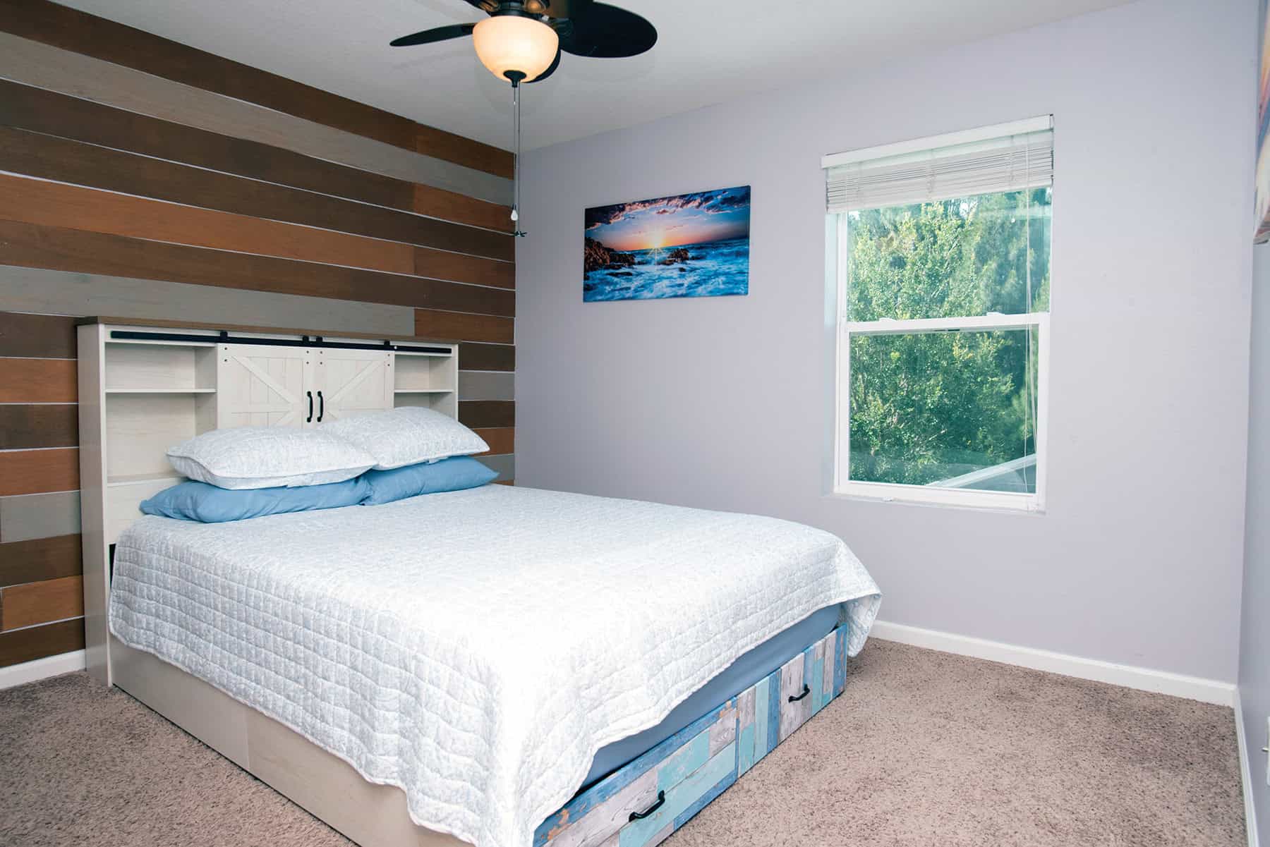 One of the bedrooms currently houses traditional bunk beds, always a kid favorite, and one has a fabulous Murphy bed. The third upper-level bedroom is enhanced by a shiplap feature wall and double bed with headboard and foot-drawers. All three have cozy carpeting, closets, ceiling fan/lights, and pleasant green views.
