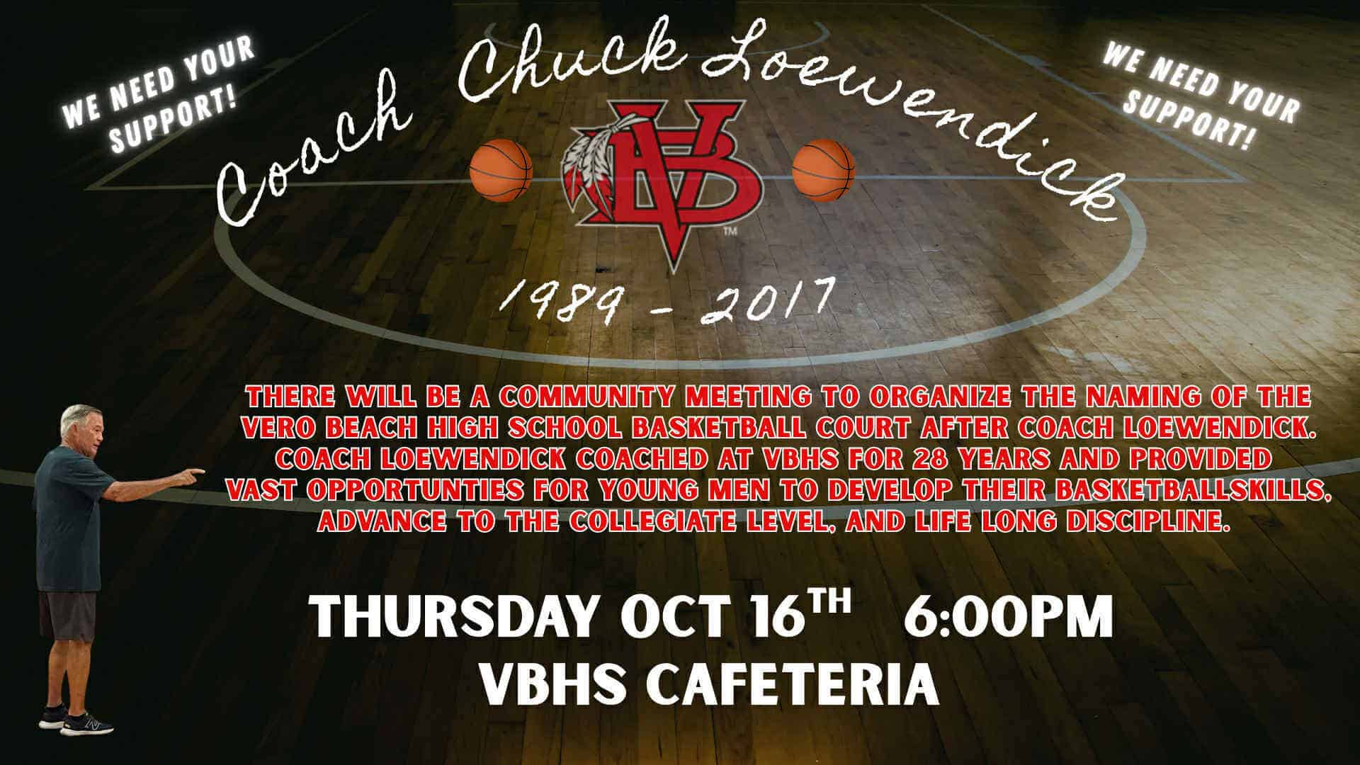There will be a community meeting to discuss naming the Vero Beach High School basketball court after Coach Loewendick. Loewendick coached at Vero Beach High School for 28 years (1989 – 2017) and provided vast opportunities for young men to develop their basketball skills, advance to the collegiate level, and have lifelong discipline.
