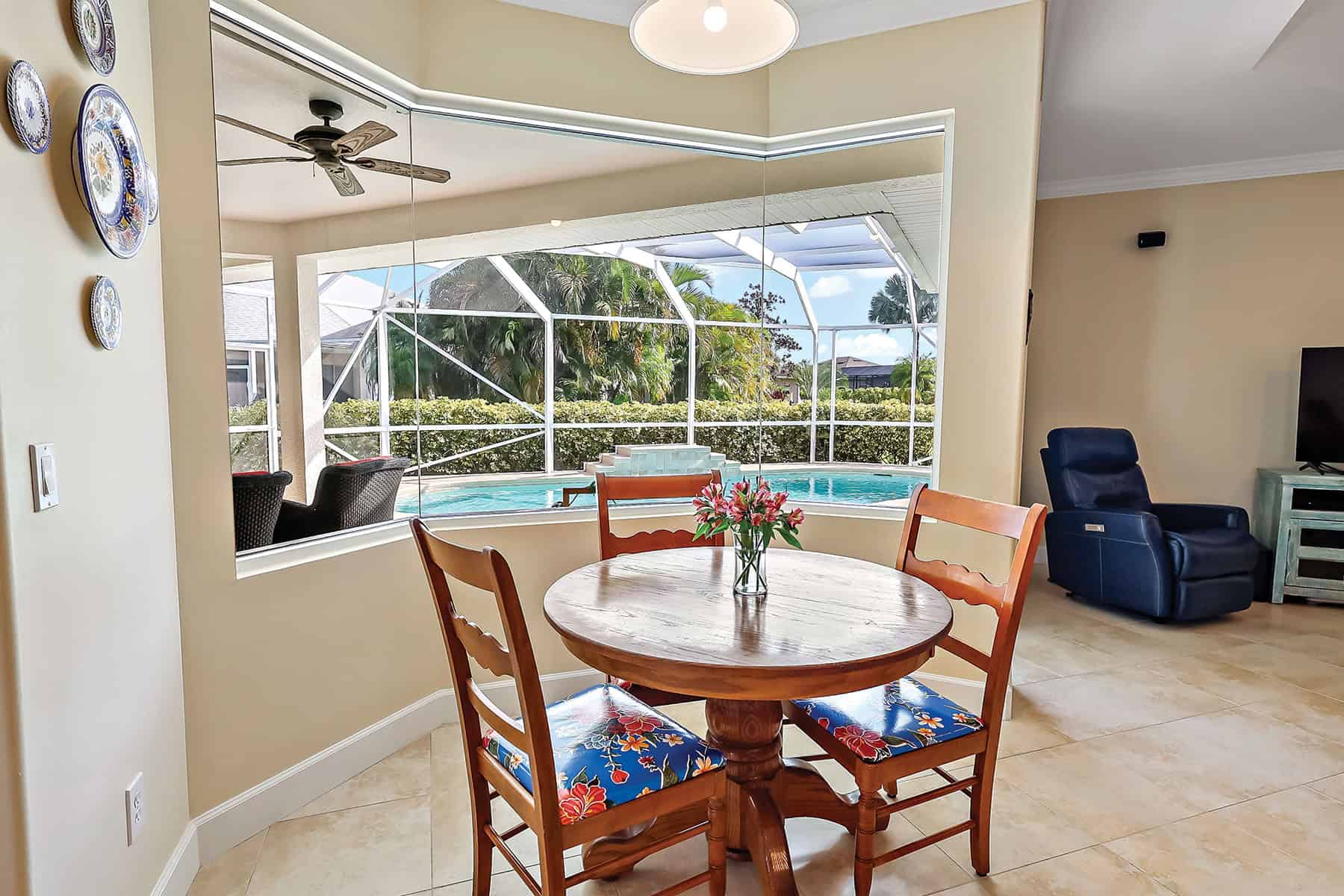 At the back of the home, French doors from the living open onto the pool patio. At an angle from the living room and just off the kitchen is an inviting breakfast nook within a window bay with a terrific view of the pool and patio.
