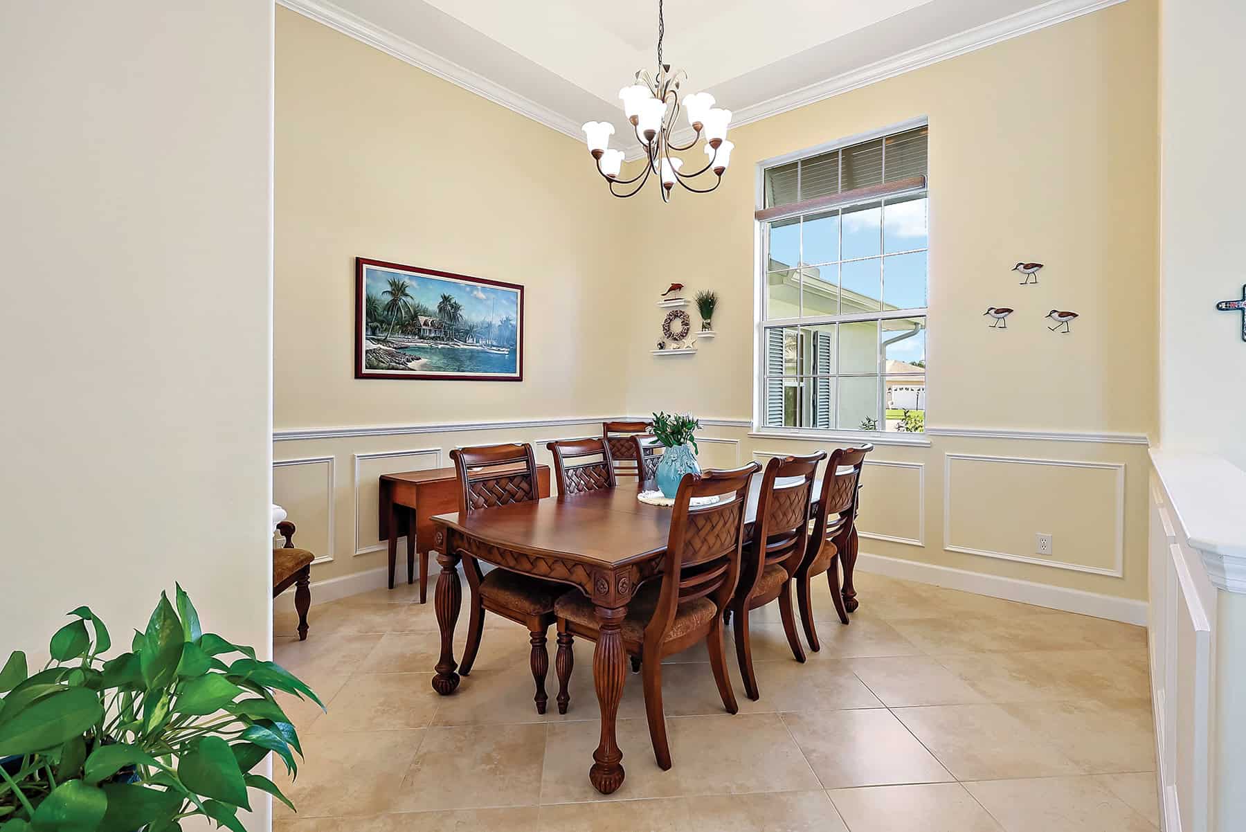 The open foyer leads into the living room. To the right, a hip wall separates the foyer from the formal dining room, where a soaring tray ceiling, wainscoting with chair rail, and a graceful chandelier help shape an elegant space.