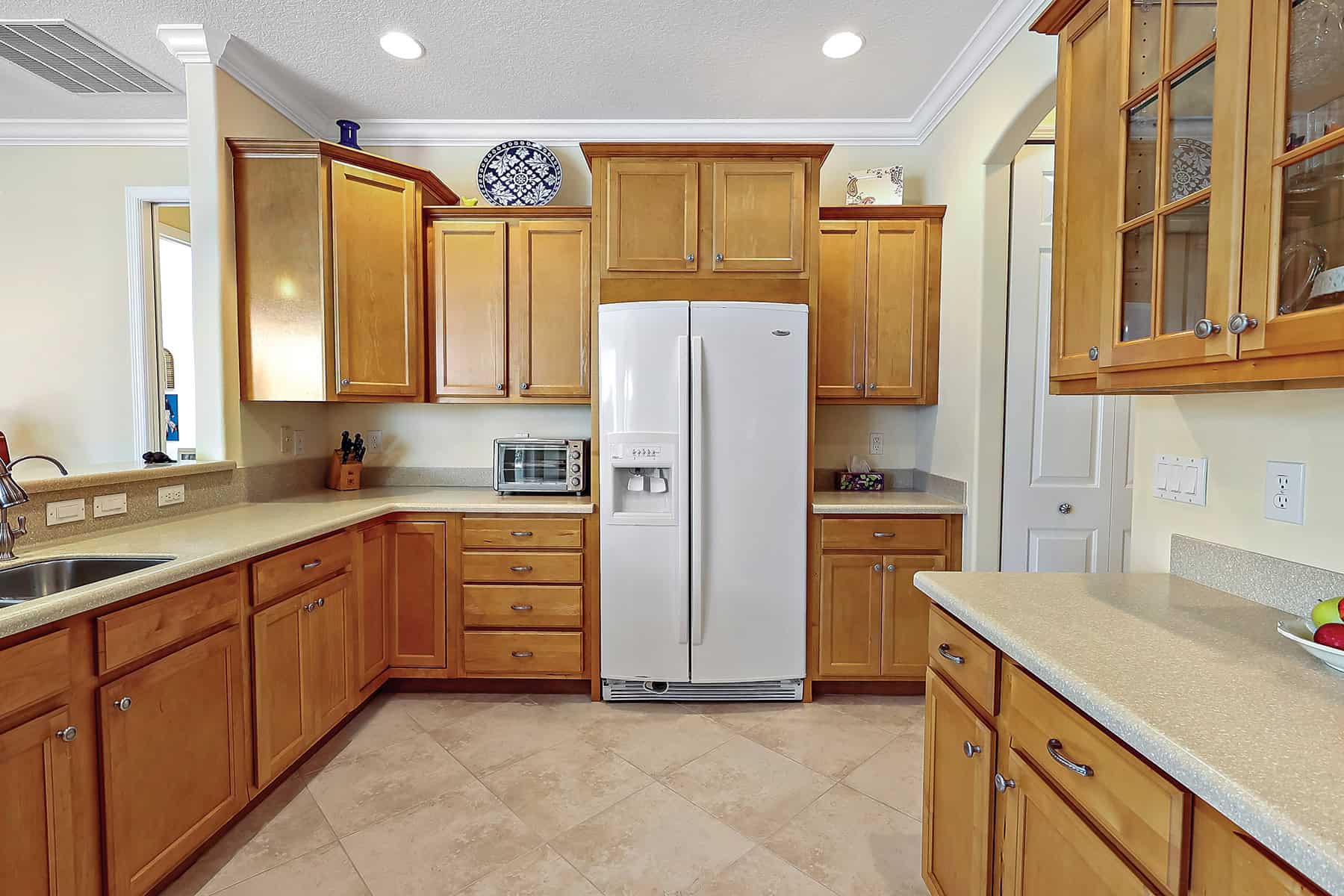The honey-hued custom wood cabinetry features shelf-top wall units artfully crafted at two different heights, crown molding, glass-front display cabinets and open display shelving. The floor cabinetry is topped with pale granite and offers a wealth of storage, a handy coffee counter, and a stainless-steel double-basin sink. The white appliances include built-in oven and microwave, smooth cook-top, and side-by-side, water-in door fridge. A pantry adds even more storage space.