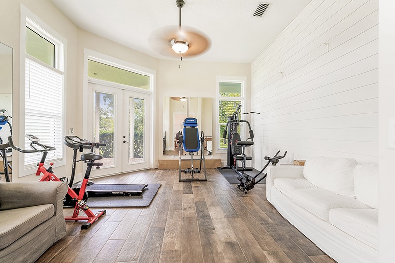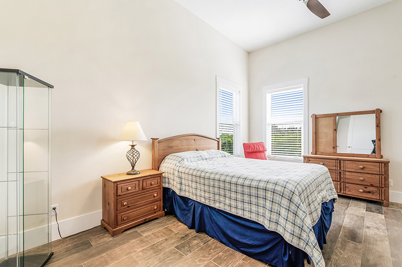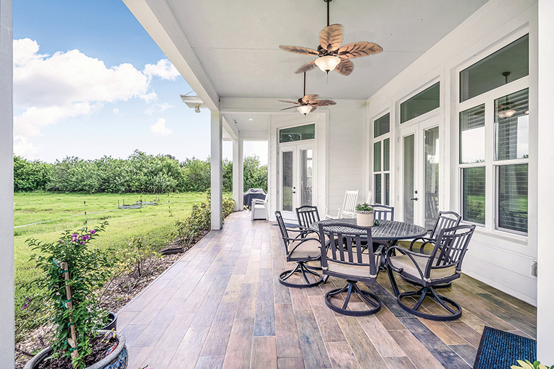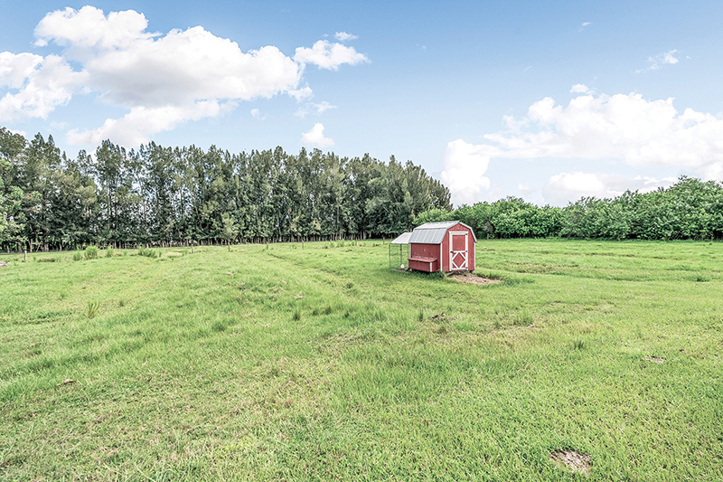 There’s also a second big family room/game room with a coffered ceiling and French doors that open onto a spacious Trax deck. The deck overlooks the long sweep of back pasture edged by Australian Pines, a fine natural windbreak that also provides a sense of privacy.