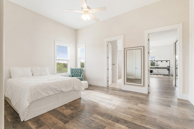 In the first-floor primary suite, you’ll find a pair of large walk-in closets, and a big bright bathroom with corner Roman soaking tub and door-free walk-in shower, both sporting tan wood-look tile. There’s also a long, angled vanity with white cabinetry and two farmhouse style basins.