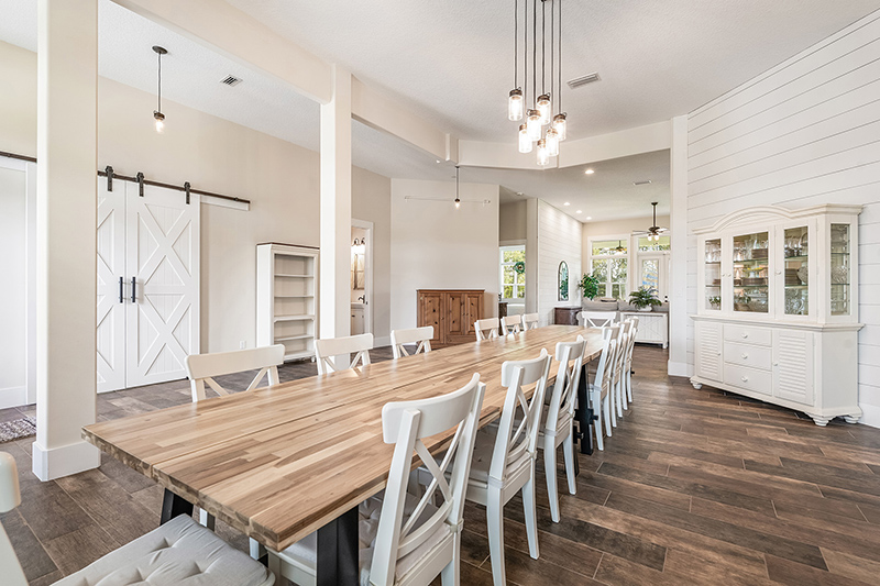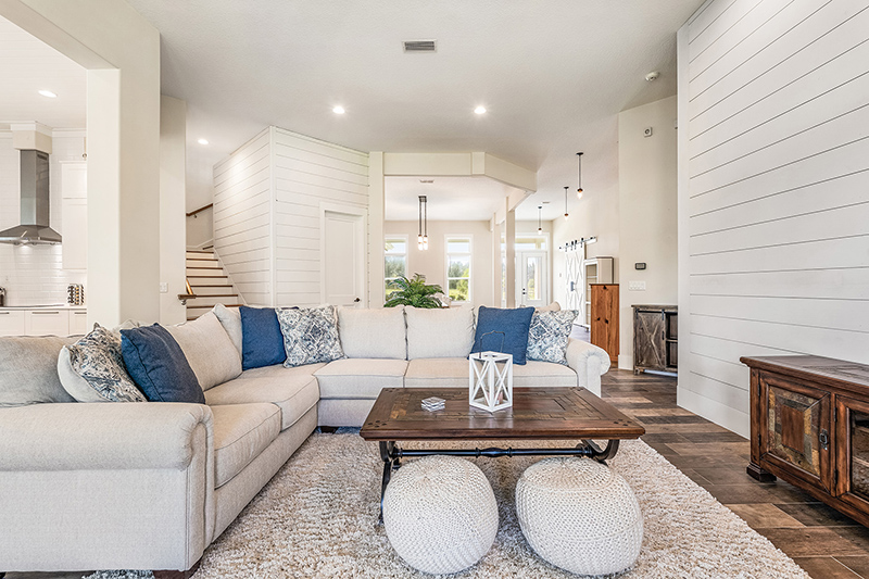 The splendid flooring – high-end, multihued, wood-look tile – flows from the foyer throughout the house, perfectly offsetting the white palette of the sophisticated interior design. Twelve-foot ceilings, recessed lighting, shiplap accent walls, and open, room-to-room entryways create an expansive, light-filled space that is casually elegant and welcoming.