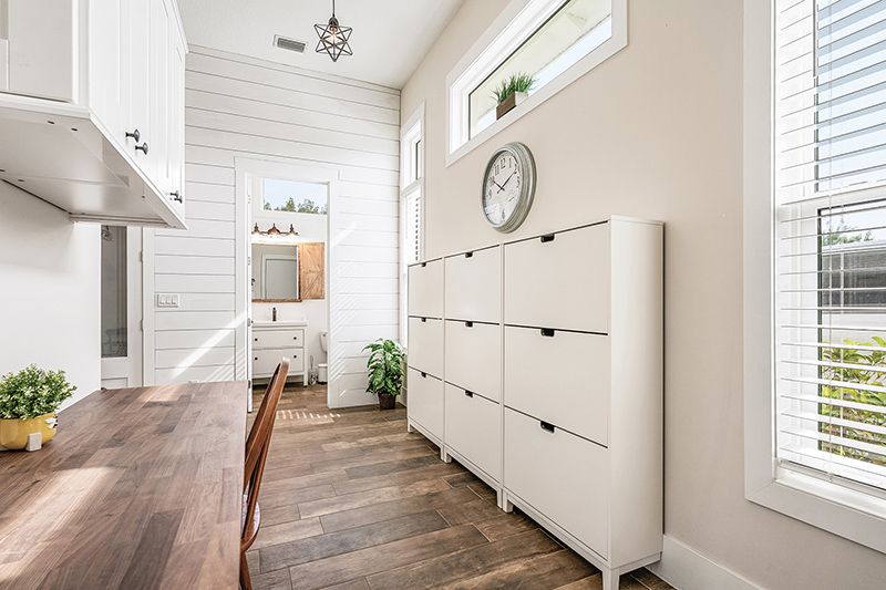 Left from the foyer, accessed via white barn doors with black hardware, is a large “craft room” with many potential uses.