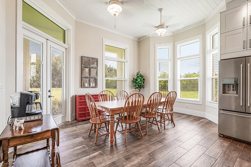 At the end of the kitchen, a breakfast nook occupies a sunny bay with four transom-topped windows and glass French doors that open onto the patio.