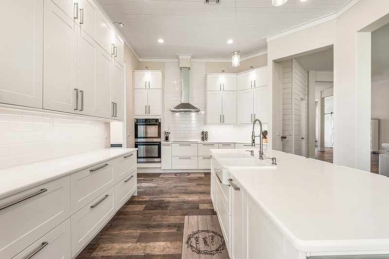 Beneath a shiplap ceiling, the dream kitchen offers extensive white cabinetry, including many drawer units, and endless stretches of glowing quartz countertop. A sleek white subway tile backsplash completes the crisp look.