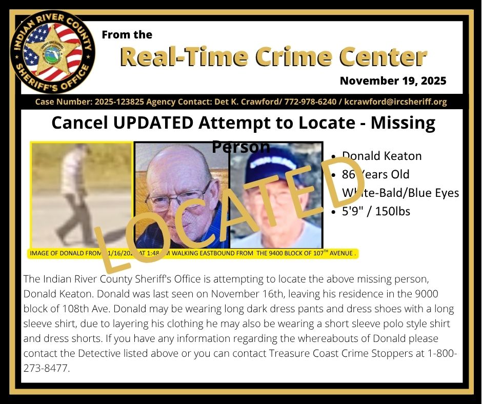- Donald Keaton found safe FLYER CONTRIBUTED BY INDIAN RIVER COUNTY SHERIFF’S OFFICE