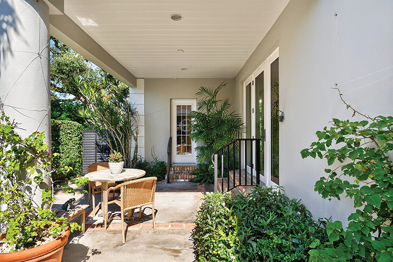 Defined by a mature live oak that offers privacy and shade, the property has a distinct sense of seclusion. The owners capitalized on this by creating a screened front entry vestibule where they often enjoyed coffee in the mornings. It is a functional outdoor space protected by the trees, ensuring you don’t feel exposed to the street.