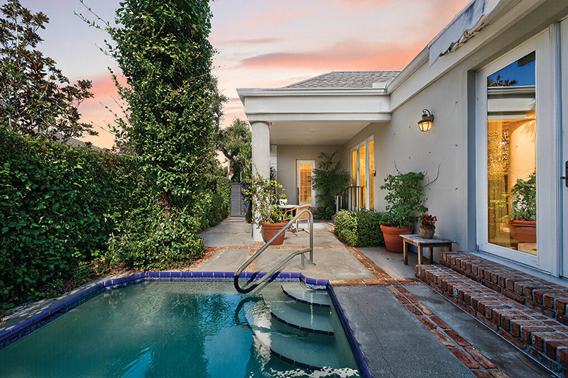 To the right of the foyer is the primary suite, a sanctuary designed for aging in place, says Daley, noting that a caregiver or nanny could live in one of the two ensuite bedrooms on the opposite side of the house. The primary bedroom is spacious enough for a writing table or chaise lounge, with windows framing the pool. Double doors lead out to the pool deck, offering the opportunity for a quick morning swim without rousing the rest of the household.