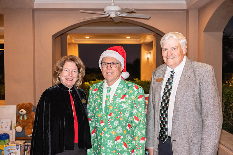 The evening began on the oceanfront veranda, where more than 200 members enjoyed cocktails against the backdrop of the incoming Cold Moon, a delightful ocean breeze, and a growing mountain of gifts that would soon make their way to deserving children. The stash of LEGOs, dolls, bikes and more were carefully laid beneath a large Christmas tree, cheerfully decorated by members along with wreaths and festive lights that really decked the halls.